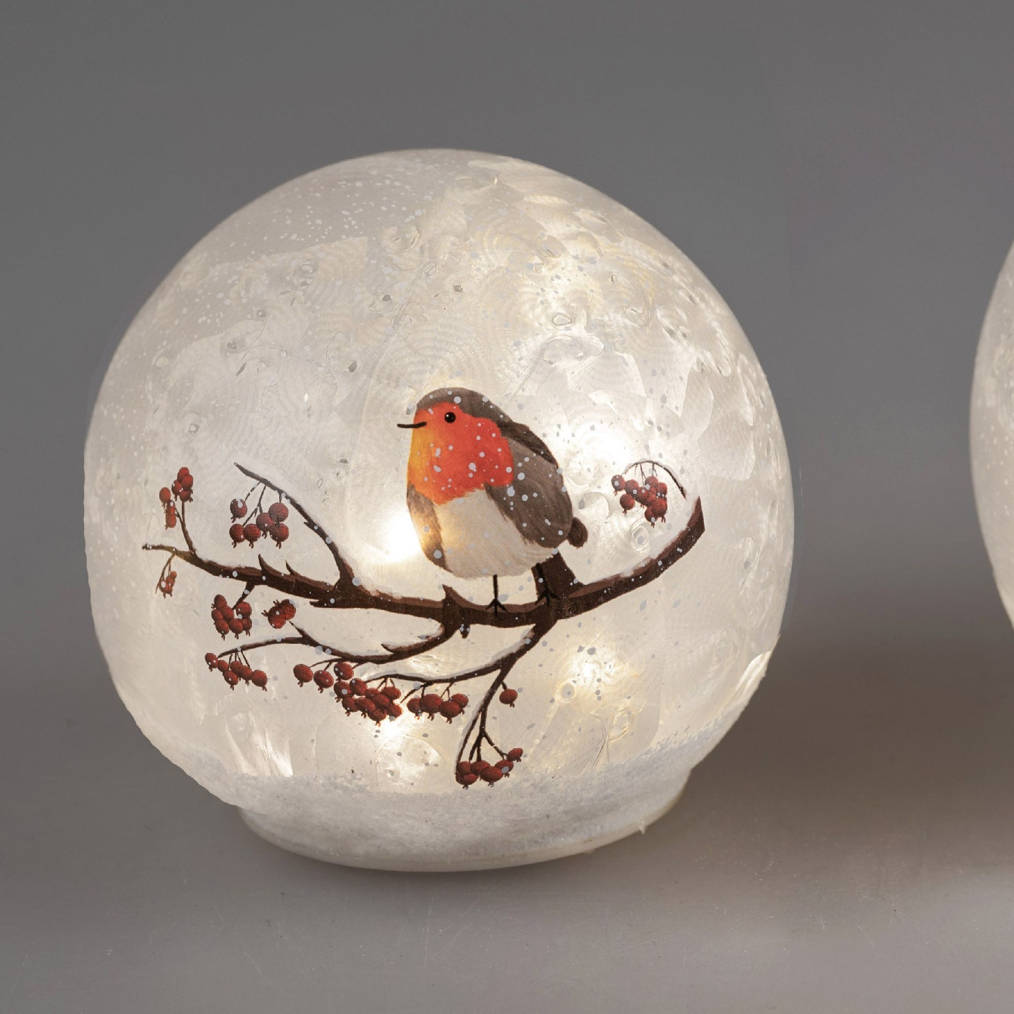 • Lieferumfang: 1 LED Deko Kugel / Stimmungslicht WINTERVOGEL zum hinstellen D. 10cm weiß aus Glas in geeister Optik mit handbemaltem Rotkehlchen Motiv auf Beerenzweig, mit Timer