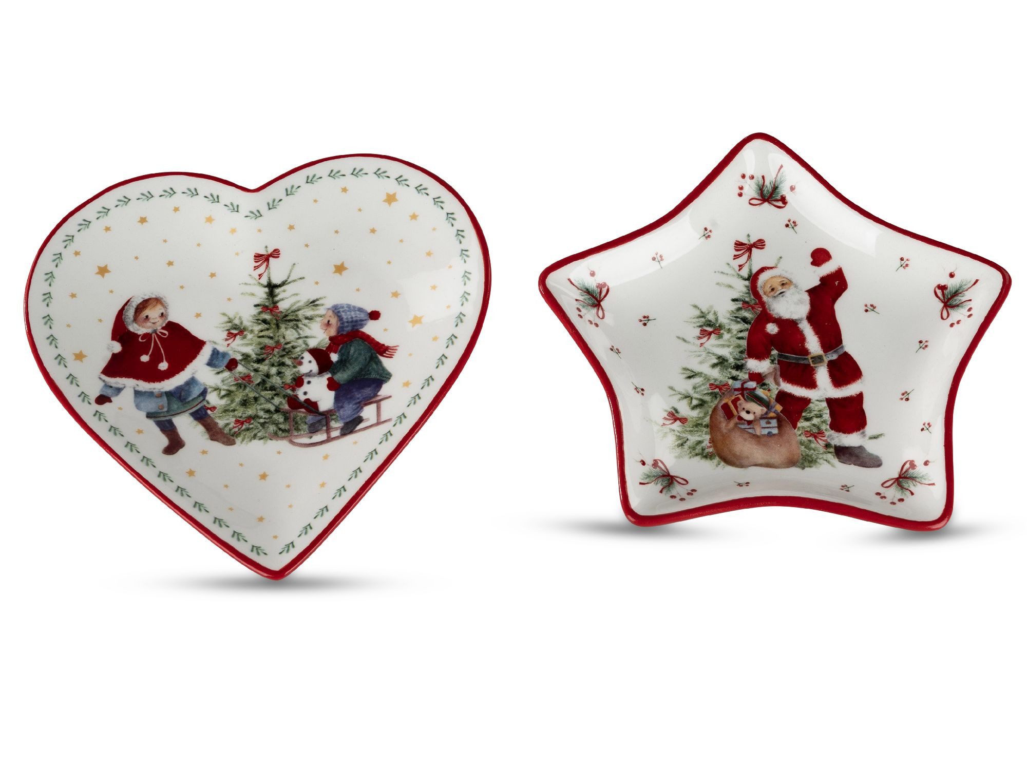 Lieferumfang: 2er Set Keksteller, Gebäckteller NOSTALGIE Herz + Stern weiß rot mit Weihnachtlichen Motiven aus glasiertem Steingut mit Lithografie-Dekor verziert
