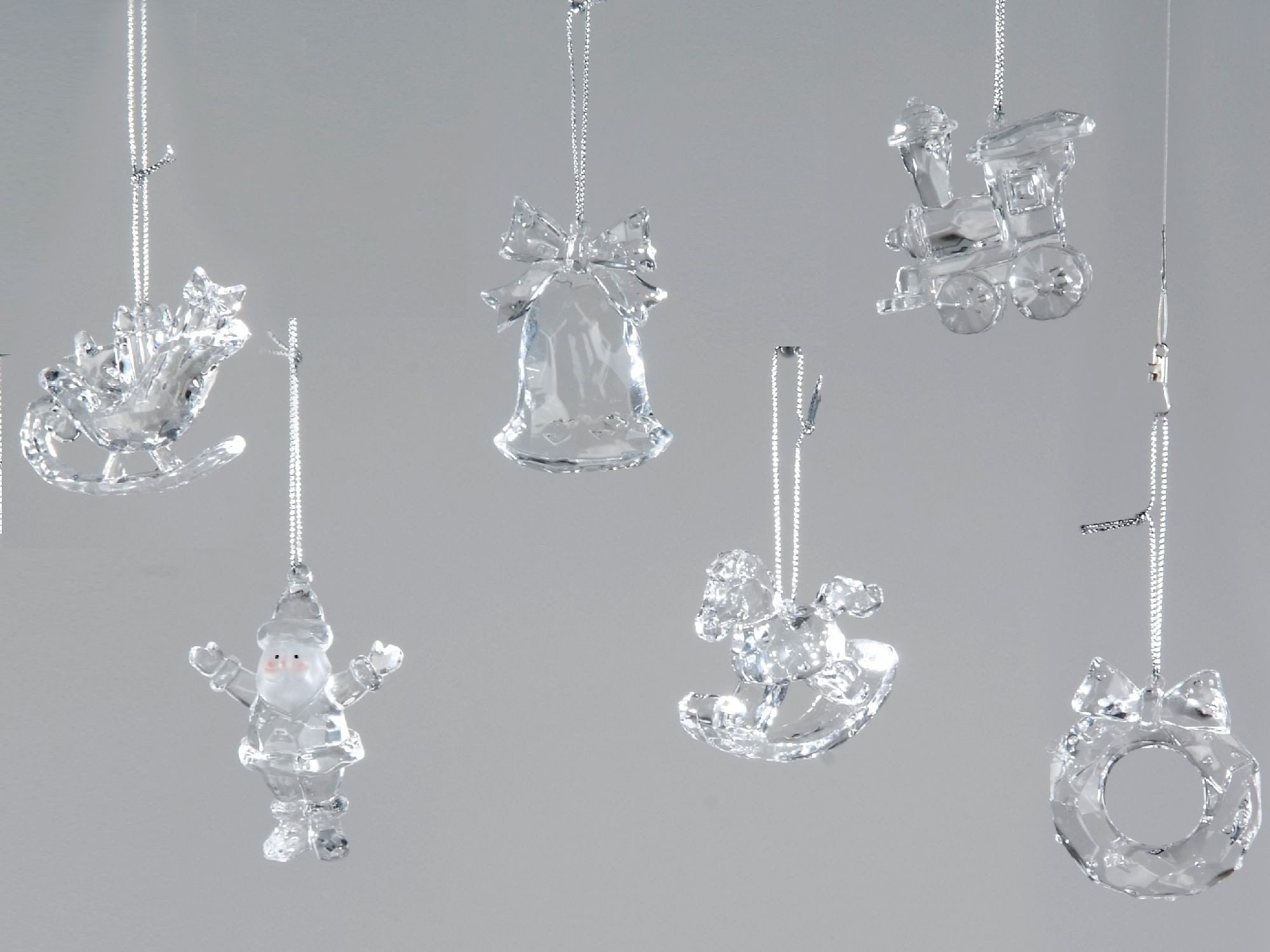 Lieferumfang: 6 verschiedene weihnachtliche Deko Hänger / Baumschmuck H. 7cm aus klarem Acryl, hochwertig und aufwendig verarbeitet