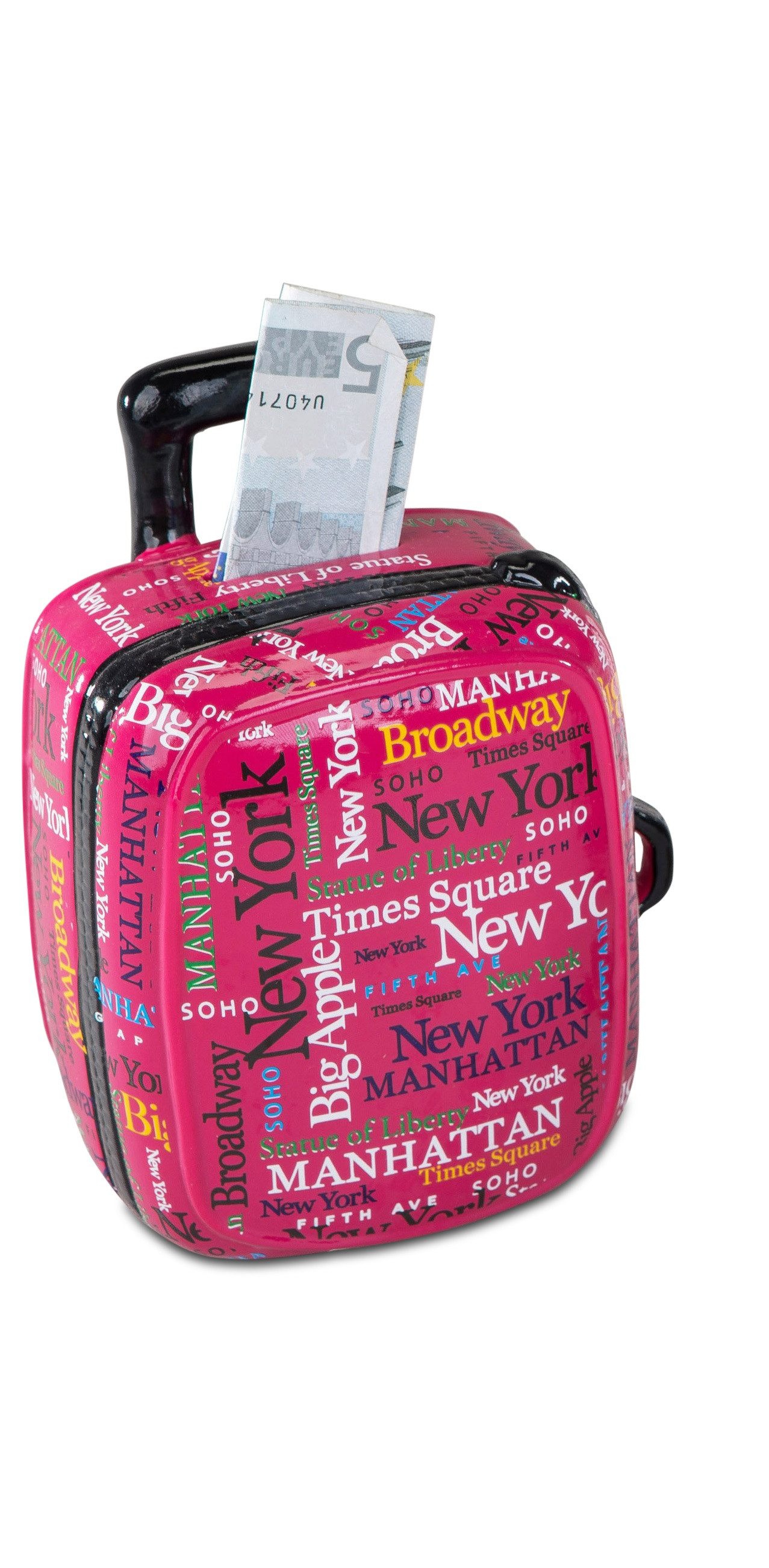 Diese originelle Spardose in Form eines kleinen Koffers (Trolli) ist nicht nur praktisch, sondern auch ein echter Hingucker! Mit ihrem detailverliebten New York-Motiv weckt sie Fernweh und Reiselust – perfekt für alle, die vom Big Apple träumen oder für den nächsten Trip sparen möchten.