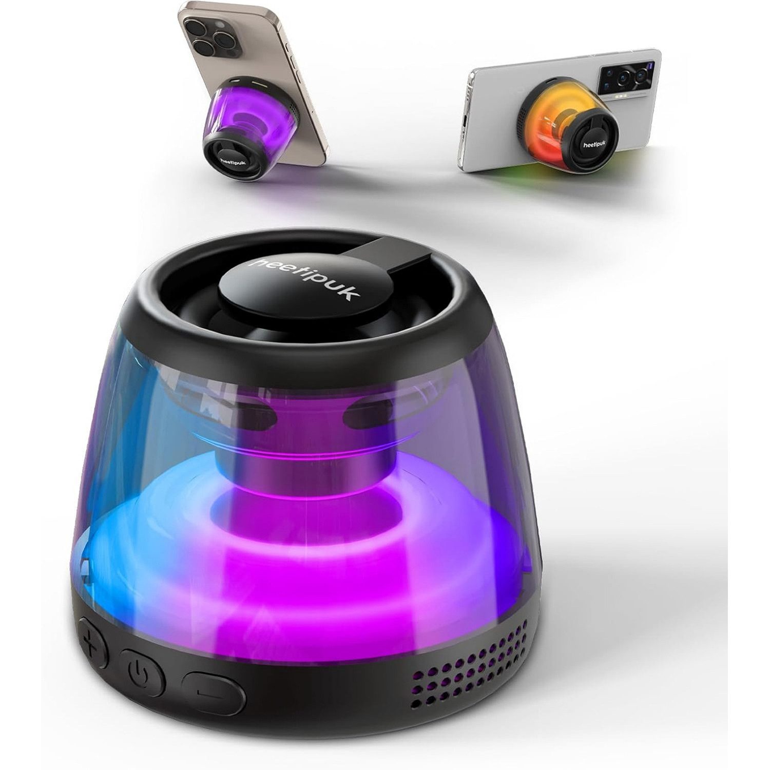 Lieferumfang | 1 x Bluetooth-Lautsprecher mit Lichtern, 1 x Umhängeband, 1 x Ladekabel, 1 x ausführliche Bedienungsanleitung (evtl. nicht in deutscher Sprache), 1 x Metallring (Hinweis: Nicht magnetische Handys können unseren Metallring auf der Rückseite des Telefons verwenden) |