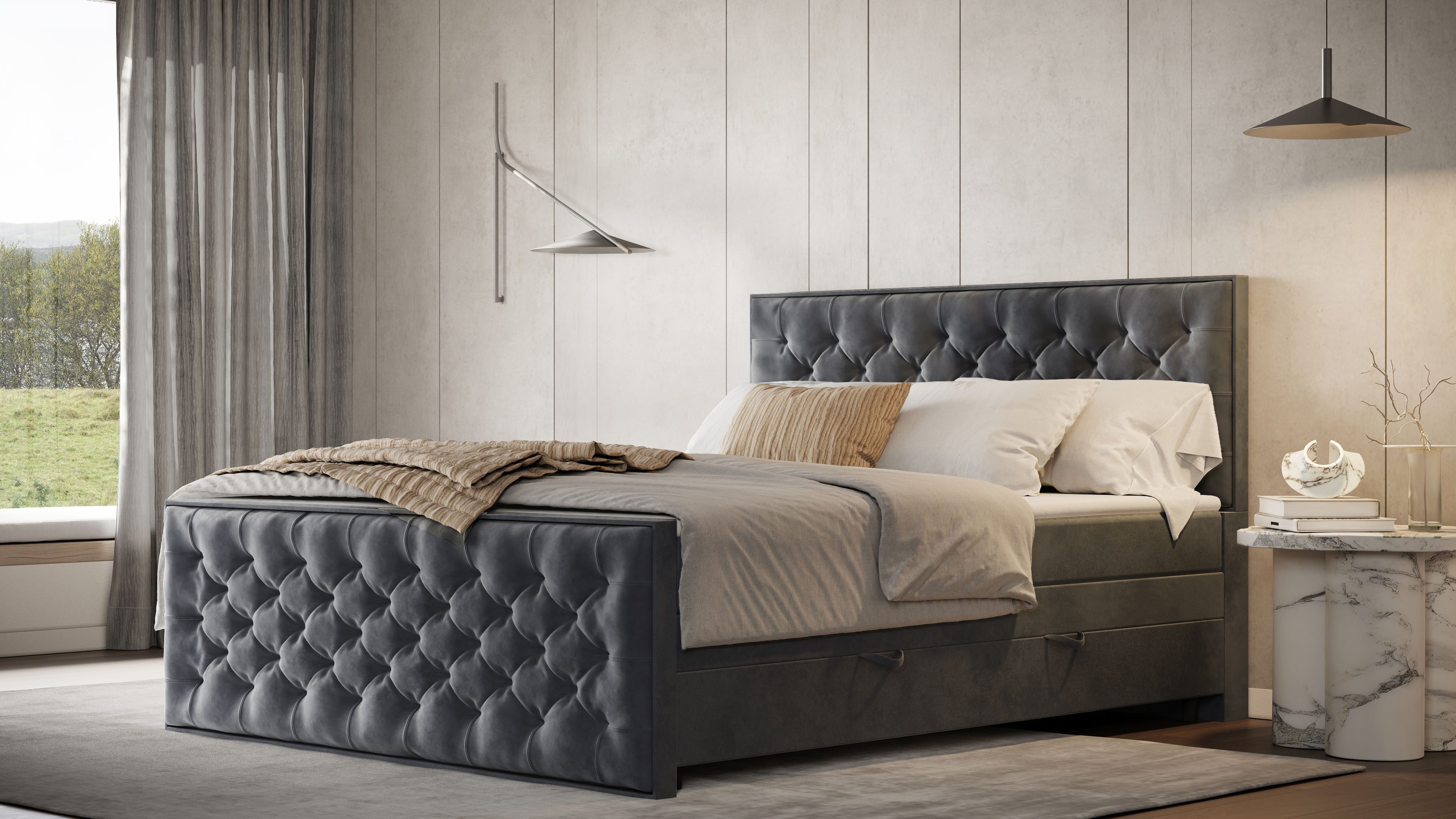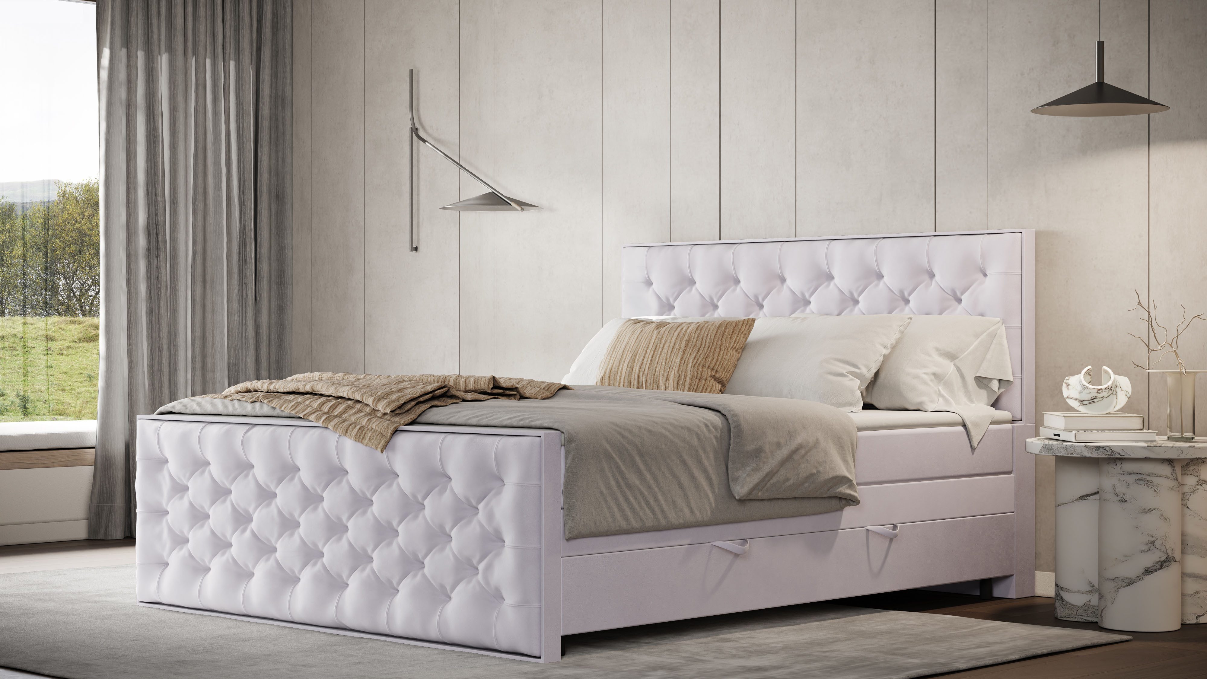 Details Korpus | Klassische Boxspring-Konstruktion. Bett mit Bettkasten, Rahmenmatratze mit Bonellfederkern, 7-Zonen-Taschenfederkernmatratze und Topper im Set. |