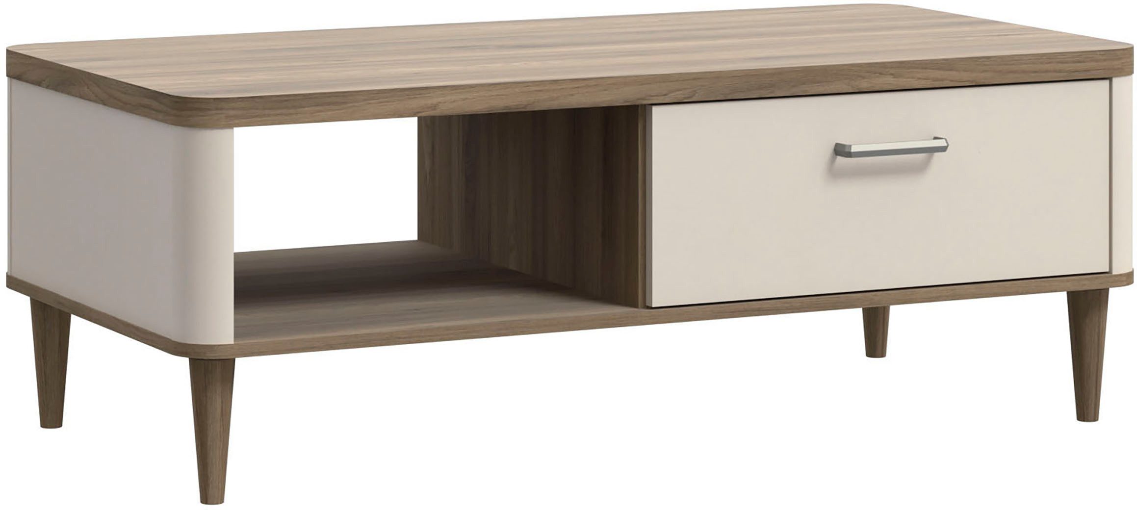 Dieser Couchtisch von FORTE hat eine Schublade für zusätzlichen Stauraum. Die matte Oberfläche der Tischplatte ist schlicht und zurückhaltend. Belastbar ist dein neues Möbelstück mit bis zu 40 Kilogramm. Die Spanplatte überzeugt mit ihrer langlebigen und verzugfreien Eigenschaft. Auch mit kleinen Details kann er überzeugen, denn der Griff besteht aus glänzendem Metall. Das Produkt wurde in Polen gefertigt. Wenn der Tisch mal Flecken abbekommt, kannst du ihn mit einem trockenen Tuch abwischen.