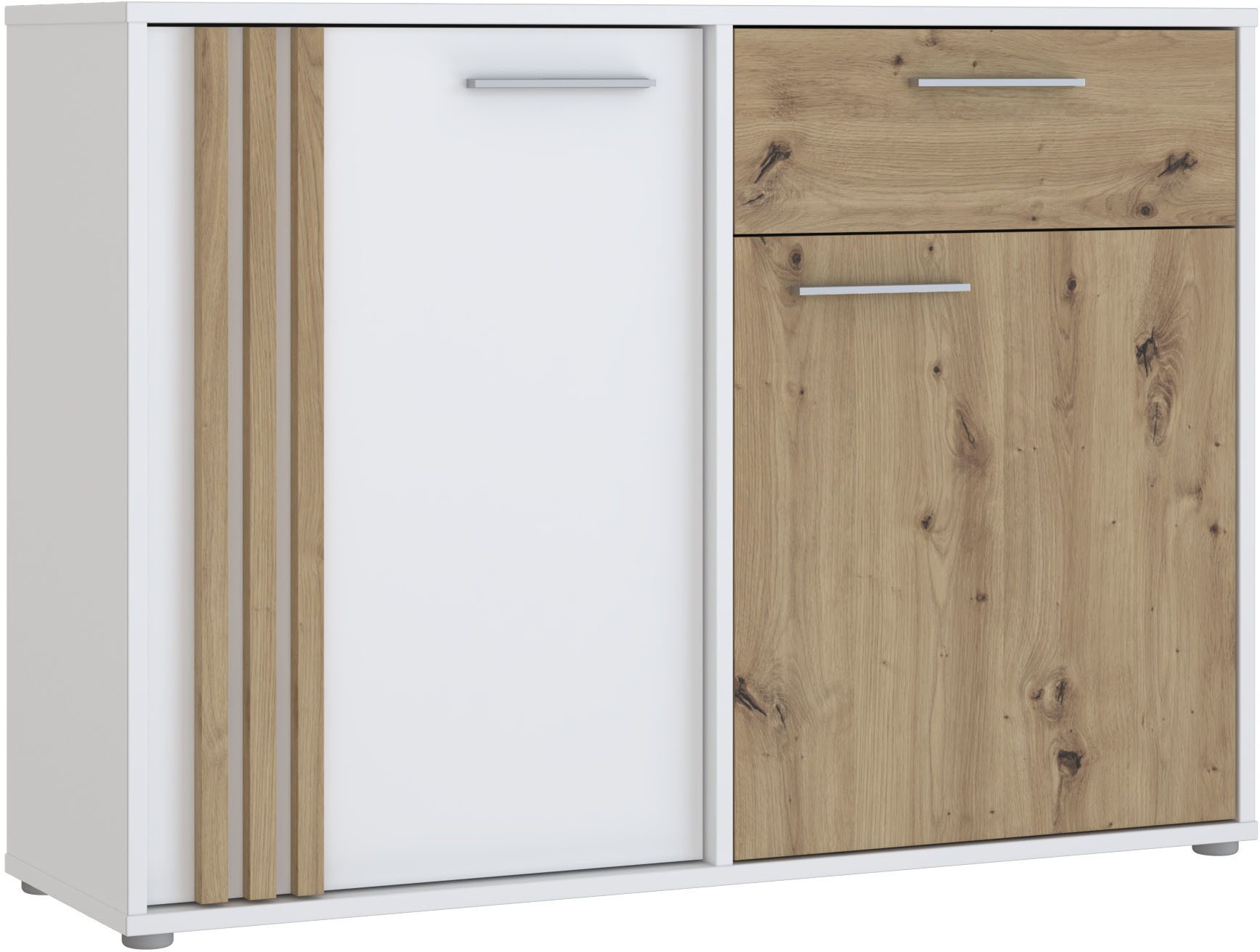 Die stabile Spanplatte, aus dem dieses Sideboard besteht, macht das Möbelstück besonders langlebig und bietet den Vorteil, dass es sich nicht verzieht. Die modernen Bügelgriffe aus Metall sind stabil und nutzen sich daher nicht so schnell ab. Das Produkt wurde in Polen gefertigt.