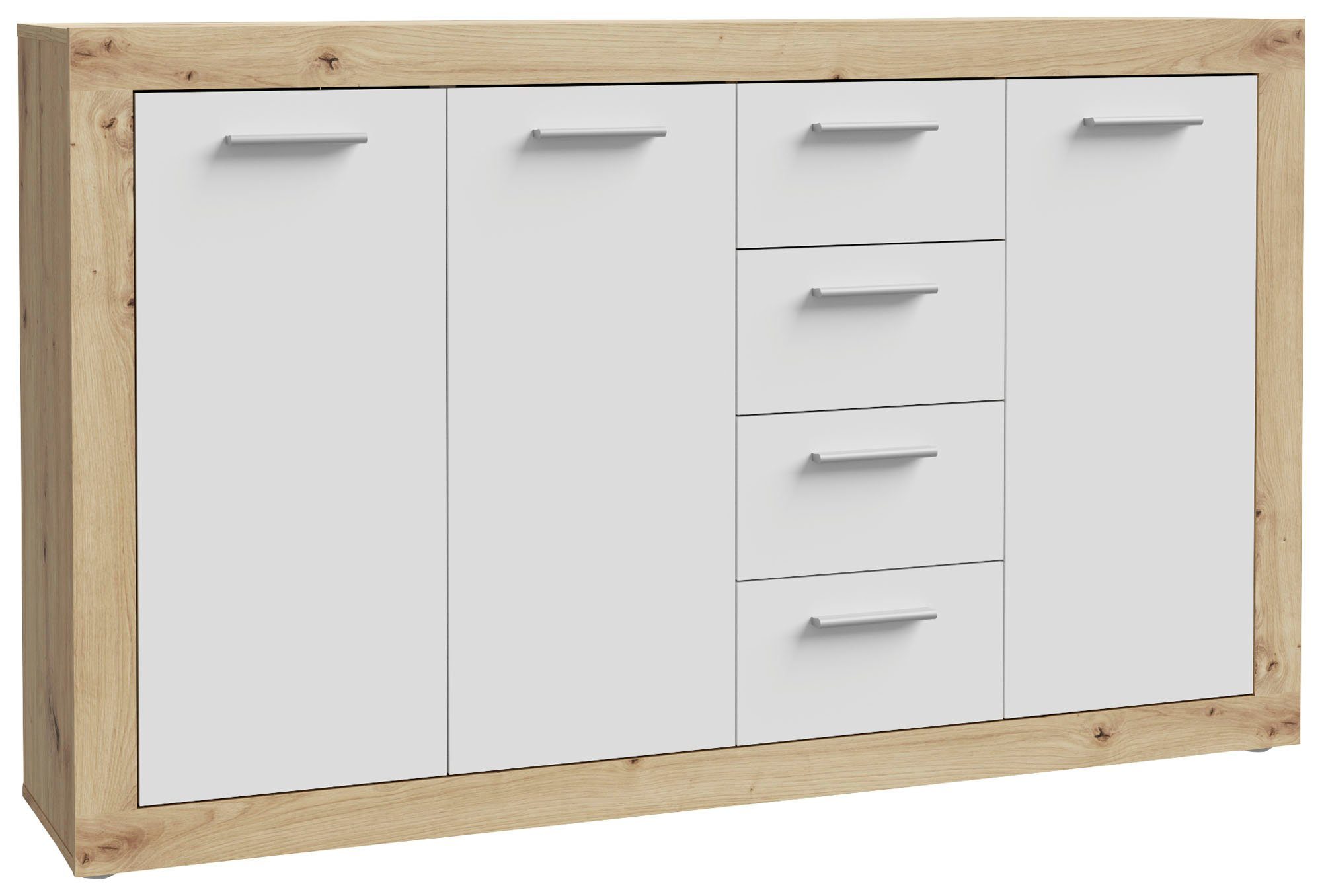 Das Sideboard zeigt sich im modernen Stil und kreiert ein stilvolles Ambiente. Um den trendigen Wohnstil zu unterstreichen und noch gemütlicher zu gestalten, sind zum Beispiel Pastellfarben empfehlenswert. Auch Accessoires wie Glas oder Naturstein passen gut. Es ist Bestandteil der Serie Baccio. Von dieser kannst du dich beim Einrichten inspirieren lassen.