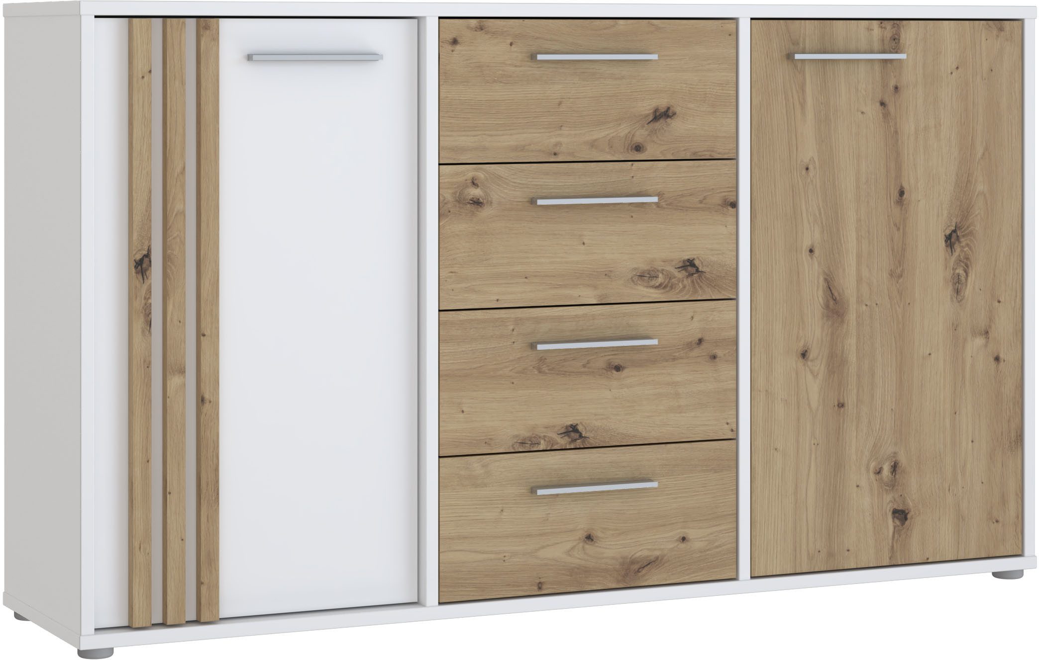 Das Sideboard wurde aus einer stabilen Spanplatte gebaut und ist damit beständig gegen Luftfeuchtigkeit. Die praktischen Bügelgriffe aus Metall sind stabil und nutzen sich daher nicht so schnell ab. Das Produkt wurde in Polen gefertigt.