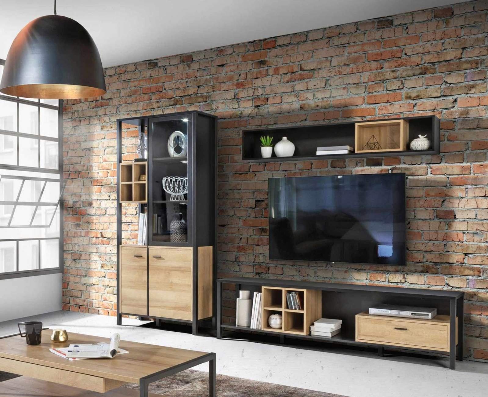 Die Vitrine hat offene Regalelemente mit verstellbaren Einlegeböden, teils hinter Glas, und einen Schrank mit Türen in Holzoptik. Das Lowboard mit offenen Fächern und einer Schublade bietet Ihnen Platz für den Fernseher und weitere Mediengeräte. Abgerundet wird das Set durch ein Wandboard, das ebenfalls ein interessantes Design hat. Wie Sie die Teile der Wohnwand HIGH ROCK kombinieren, bleibt Ihnen überlassen. Mit den stylishen Möbeln ist Ihr Wohnzimmer perfekt eingerichtet.