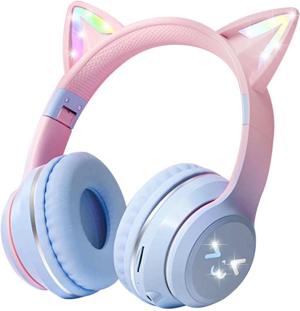 Das markante Design mit bunten LED-Leuchten an beiden Ohrmuscheln zieht nicht nur Blicke auf sich, sondern schafft auch eine spielerische Atmosphäre beim Hören. Die Lichtmodi lassen sich einfach per Taste steuern oder ganz ausschalten – ideal zum Energiesparen oder für ruhige Umgebungen wie Schule oder Bibliothek.