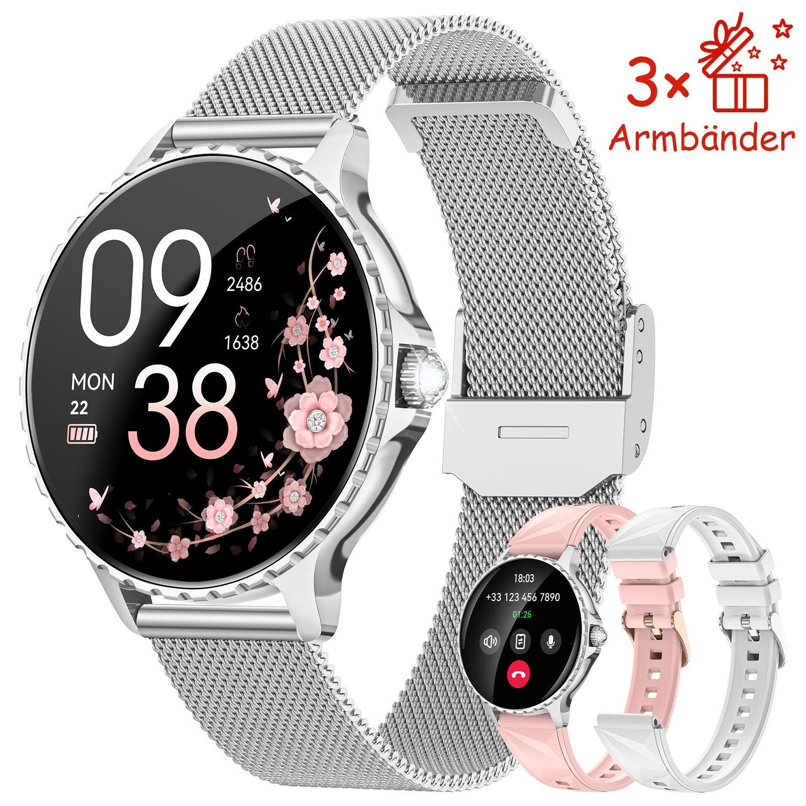 Diese Smartwatch Damen kommt mit einem klassischen Milanaise-Armband in Silber sowie zwei zusätzlichen weichen Silikonarmbändern in Rosa und Weiß. So passt sich der Fitnesstracker flexibel Ihrem Stil an – von sportlich bis elegant. Das florale Kirschblüten-Zifferblatt mit Schmetterlingsmotiv verleiht dieser Sportuhr einen verspielten, romantischen Charakter.