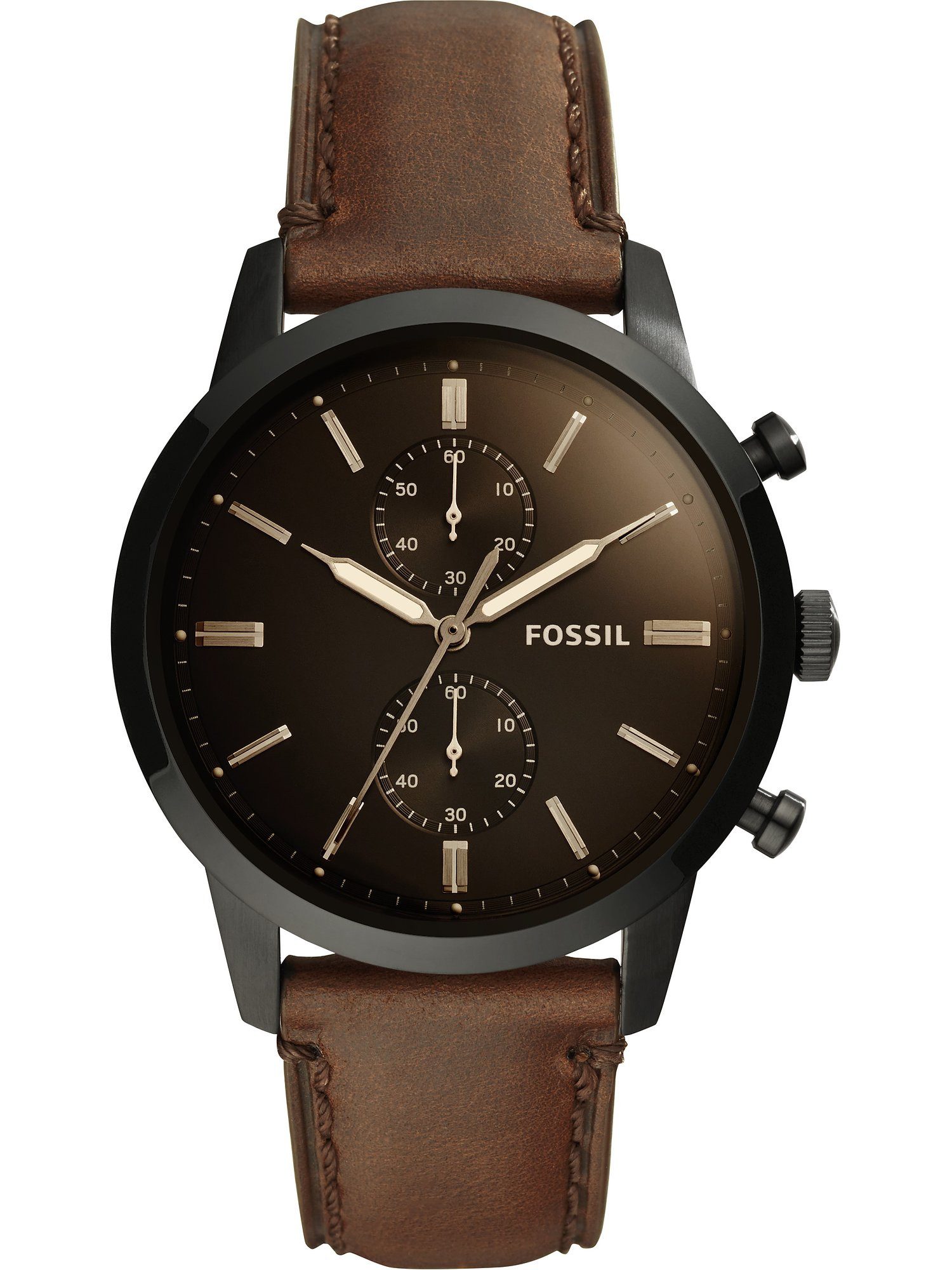 Fossil kombiniert das Beste aus Vergangenheit und Gegenwart zu einem einzigartigen Stil. Die amerikanische Marke ist bekannt für Kreativität, Innovation und ein unschlagbares Preis-Leistungs-Verhältnis, das wie die Uhren selbst einfach Spaß macht! Für Herren, die in Sachen Stil und Qualität keine Abstriche machen möchten, ist die Fossil Townsman die optimale Wahl. Dieser sportive Chronograph kombiniert ein robustes Edelstahlgehäuse mit einem sportlichen Lederband. Die Fossil Townsman ist schwarz mit einem schwarzen Armband und einem schwarzen Ziffernblatt. Das runde Gehäuse wirkt stilsicher und edel. Durch die Markierungen fällt die Orientierung auf dem Ziffernblatt leicht, so dass die Zeit gut ablesbar ist. Geschützt wird das Ziffernblatt von einem robusten Mineralglas. Der Chronograph zeigt auf den Hilfszifferblättern die typischen Komplikationen wie Totalisatoren und eine Stoppfunktion. Die Uhr erhält durch das braune Leder-Band eine gewisse Eleganz und wird durch die Dornschließe am Platz gehalten. Beste Ablesbarkeit auch bei Dunkelheit oder schlechtem Licht ermöglichen die Leuchtzeiger. Bei einer Wasserdichte von bis zu 5bar ist die Uhr vor dem Eindringen von Feuchtigkeit bestens geschützt. Gleichzeitig sorgt das Quarz-Werk für Präzision. Diese Uhr von Fossil ist mehr als nur ein Accessoire – sie ist eine durchdachte Wahl für alle, die Wert auf Qualität und Stil legen.