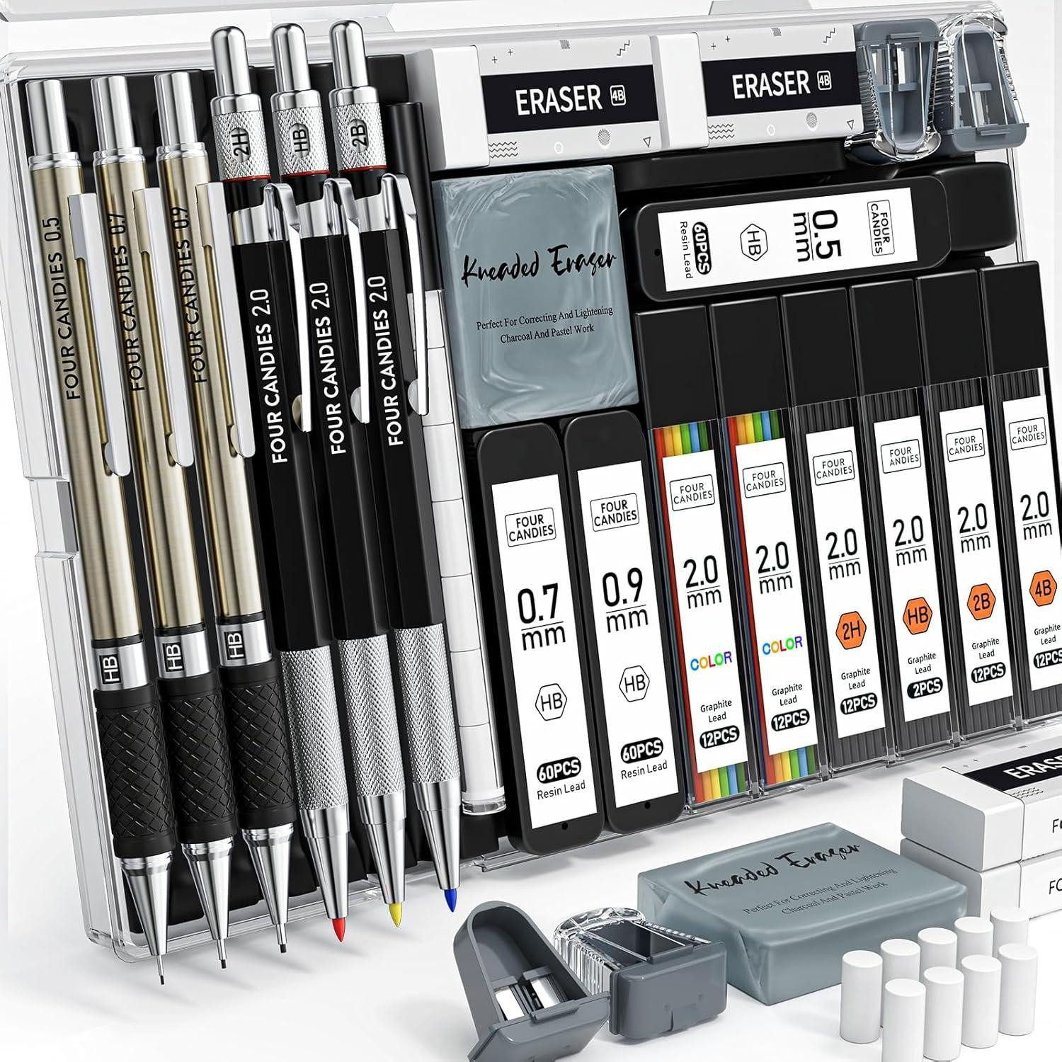 Ein mechanisches Stift-Set, das für Künstler, Profis, Lehrer und Schüler gleichermaßen entwickelt wurde. Perfekt zum Schreiben, Entwerfen, Zeichnen und Skizzieren. Das Set enthält einen knetbaren Radiergummi und einen Spitzer im Deckel eines 2,0-mm-Minenhalters sowie zusätzliche Minenspitzer. Zwei Arten von rutschfesten Griffen bieten optimalen Komfort und Kontrolle beim Arbeiten. Mit verschiedenen Härtegraden und Farben an Minen-Nachfüllungen ist für jede künstlerische Anforderung gesorgt.Das Set enthält 3 metallische Zeichen-Mechanikstifte (0,5, 0,7, 0,9 mm), 3 Minenstifte, verschiedene Grafitminen (HB) und Farbminen, weiche Radiergummis, einen knetbaren Radiergummi, Minenspitzer und Kappe-Radiergummi-Nachfüllungen. Всеs ist in einer praktischen Kunststoff-Mechanikstift-Hülle organisiert. Holen Sie sich dieses exquisites Künstler-Set und lassen Sie Ihrer Kreativität freien Lauf!