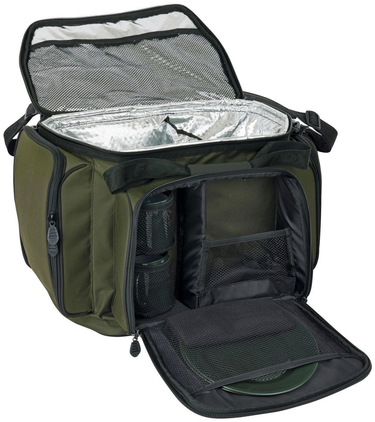 Fox R-Series Cooler Food Bag 2 man - Kühltasche + Campingsgeschirr - Die Angeltasche von Fox ist eine tolle Essenstasche auf mehrtägigen Angeltouren. Die Tasche ist mit einem zentralen Hauptfach ausgestattet, das thermoisoliert ist und somit die Nahrungsmittel frisch hält. Zudem besitzt dieses Fach eine Unterteilung, wodurch eine getrennte Lebensmittellagerung ermöglicht wird. In der großen Fronttasche befindet sich Geschirr für zwei Personen, wie beispielsweise je zwei Gabeln, Messer, Kaffeelöffel, Esslöffel, Teller, Tassen sowie verschiedene Tools. In einem weiteren Staufach lassen sich weitere Dinge unterbringen, so dass man in der kompakten Kühltasche all das mitnehmen kann, was man beim Karpfenangeln und Wallerangeln für ein Dinner zu zweit benötigt.