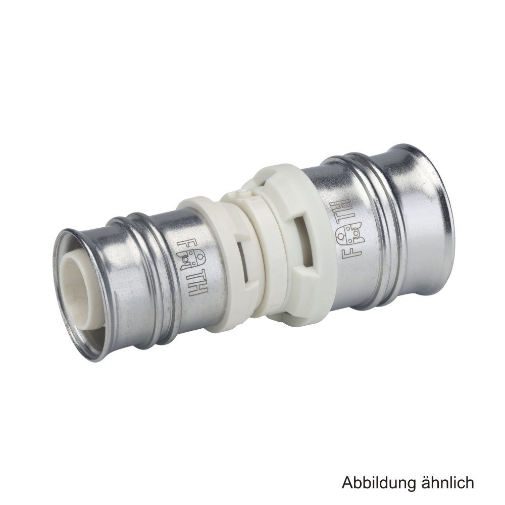 Kupplung reduziert aus PPSU zur Installation von Trinkwasser- und Heizungssystemen mit weißen Fixierringen mit integrierten Sichtfenstern, fixierten Edelstahlpresshülsen. Durchflussoptimiert mit Leckagefunktion, unverpresst undicht bei Druckprobe mit Wasser bei 1 bis 6,5 bar. Verpressbar mit den Presskonturen F und TH. FK82826130