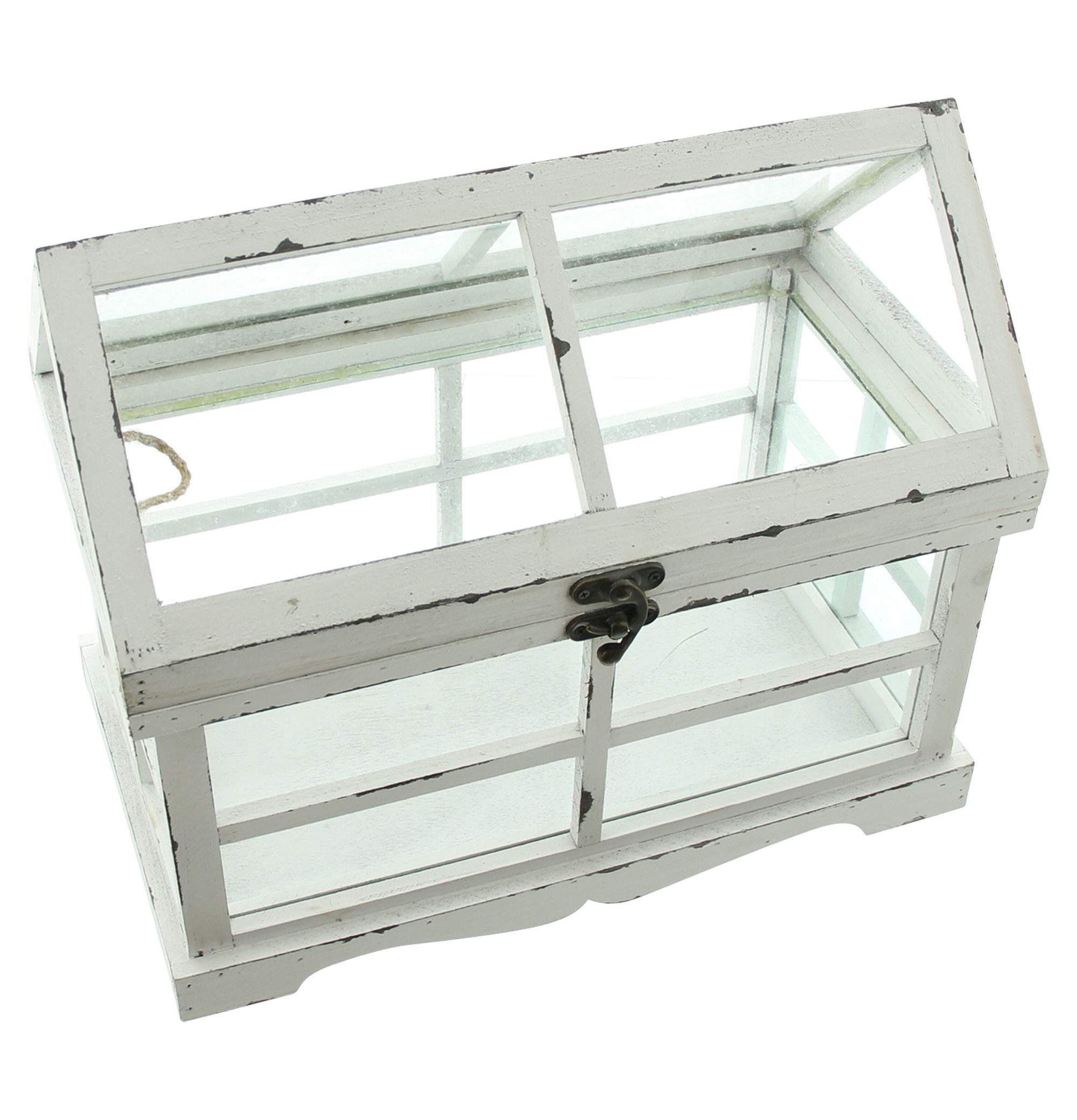 Nutzen Sie das Gewächshaus "Shabby" als stilvolle Aufbewahrung für kleine Pflanzen oder zur Präsentation von Deko-Elementen in Ihrem Zuhause. Ideal für Fensterbänke, Tische oder als hübsches Accessoire in Ihrem Garten!