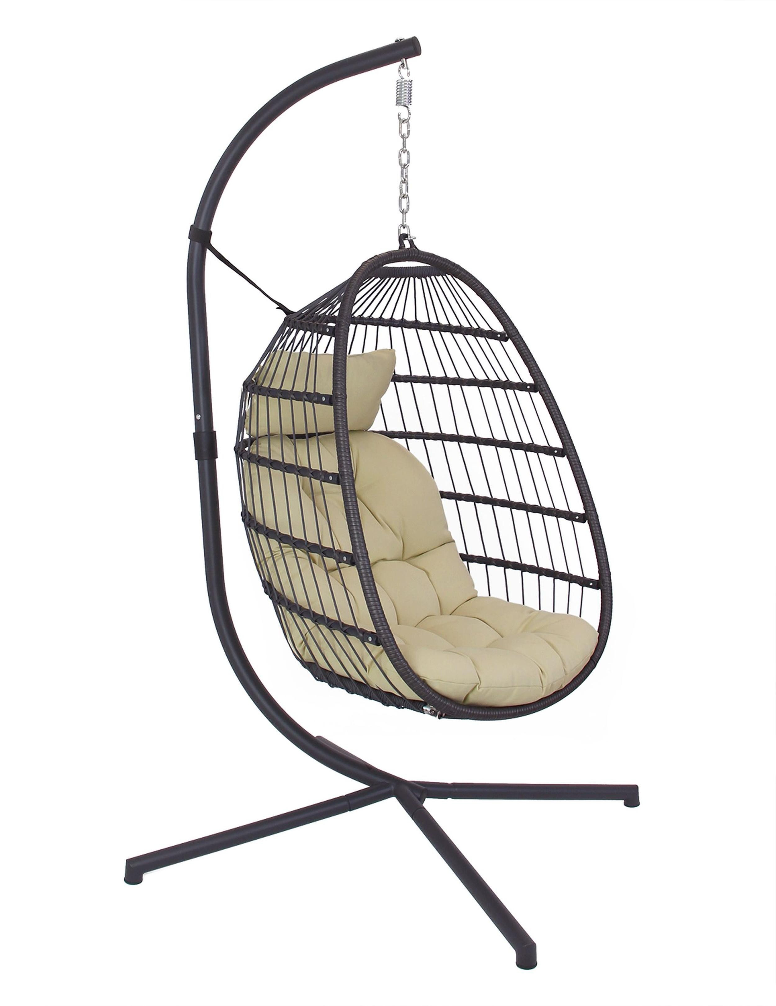 Hängesessel "Suez" mit Gestell: Frei schaukelnder Hängesessel aus Kunststoffgeflecht in edlem Anthrazit. Mit Fixierband, dick gepolsterten Kissen (100% Polyester) und pulverbeschichtetem Metallgestell. Belastbarkeit ca. 110 kg.