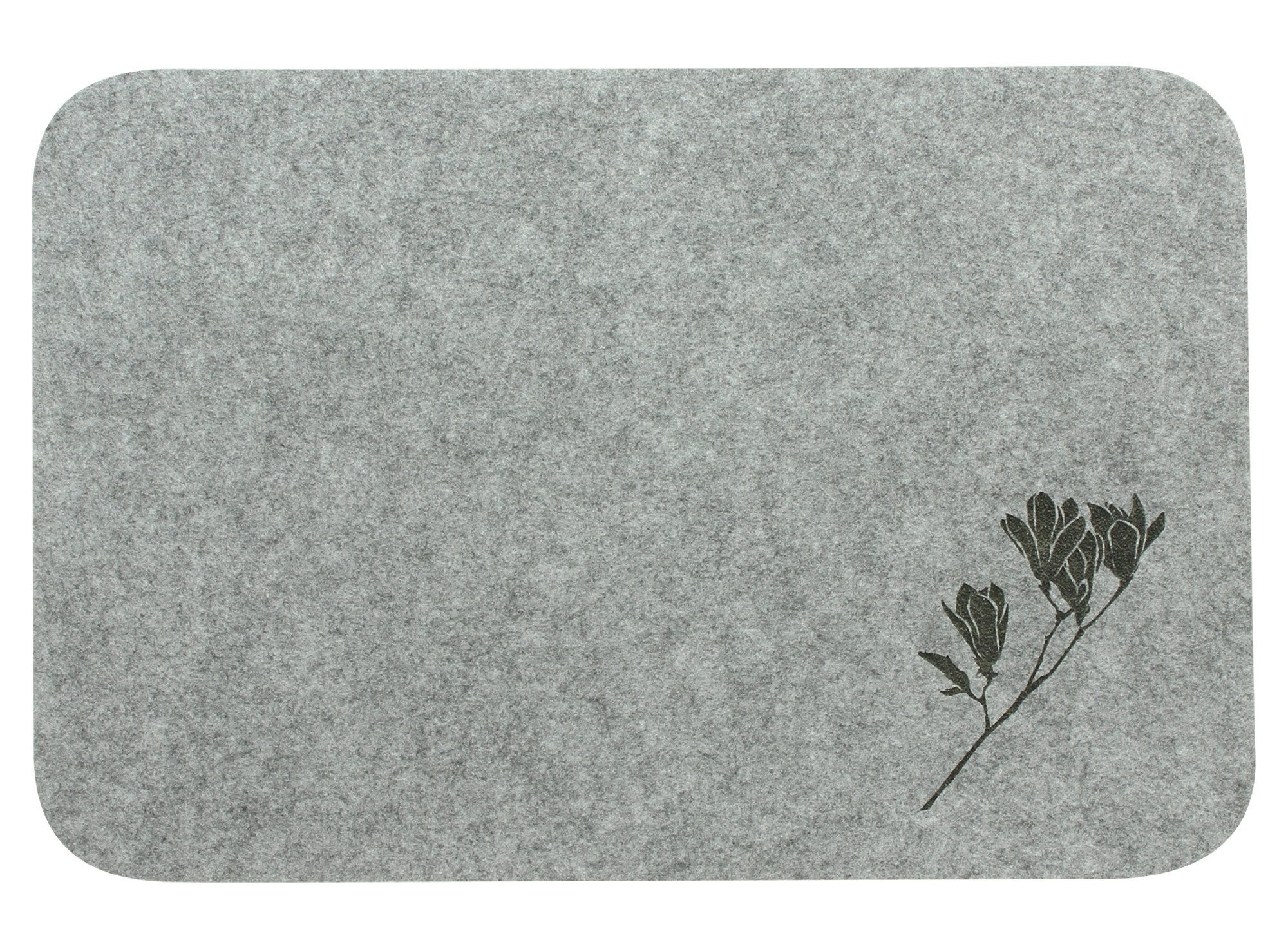 Verleihen Sie Ihrem Tisch eine stilvolle Note mit diesem eleganten Platzmatten-Set aus Filz. Die matte Oberfläche in Grau wird durch ein geprägtes Blütenzweig-Motiv in edlem Anthrazit akzentuiert – dezent und dennoch dekorativ.