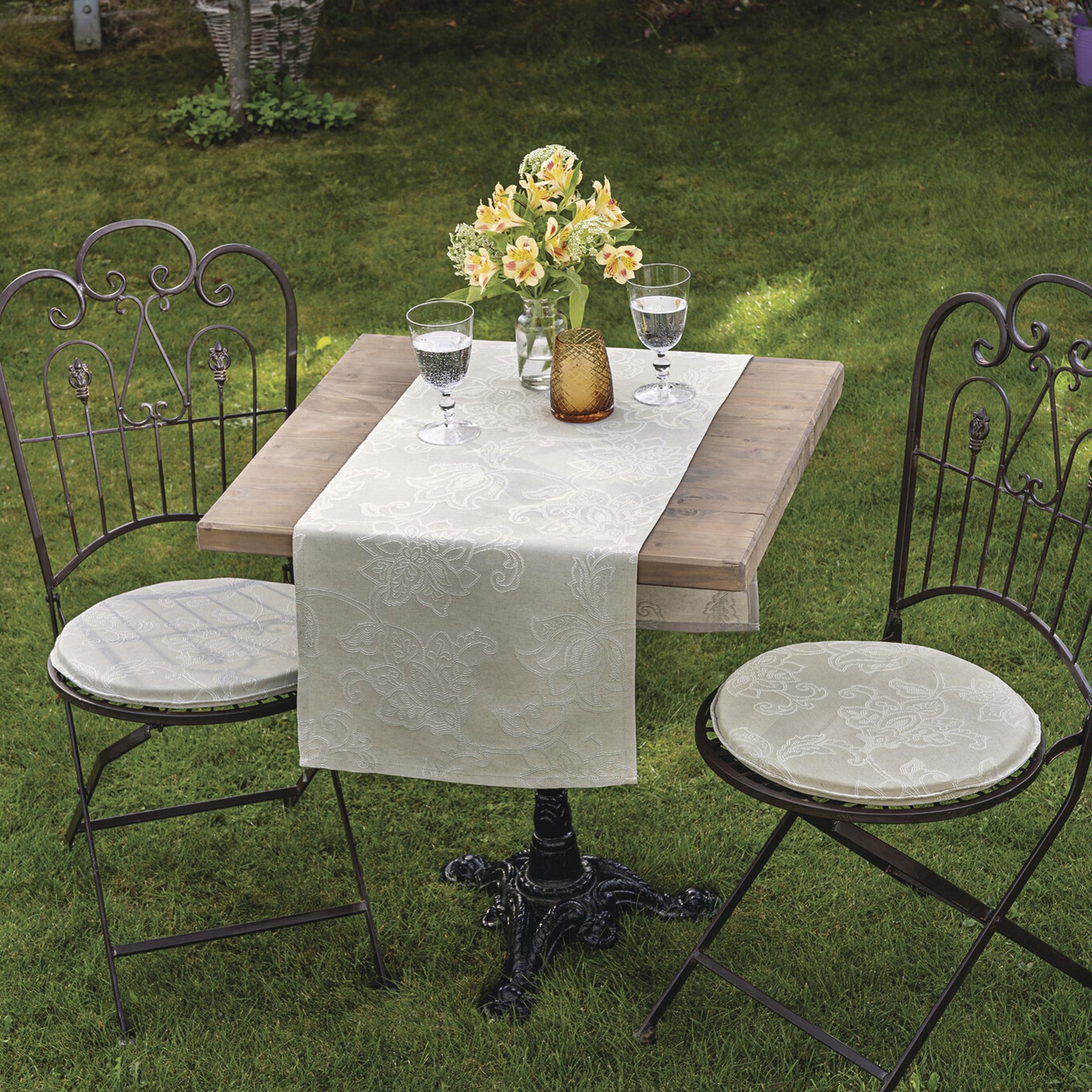Sitzkissen "Romantique", rund: Wunderschönes Accessoire. Beigefarbener Grundstoff filigran bestickt. Kleiner Steg für Stabilität. 50% Baumwolle, 50% Polyester, weich & robust.