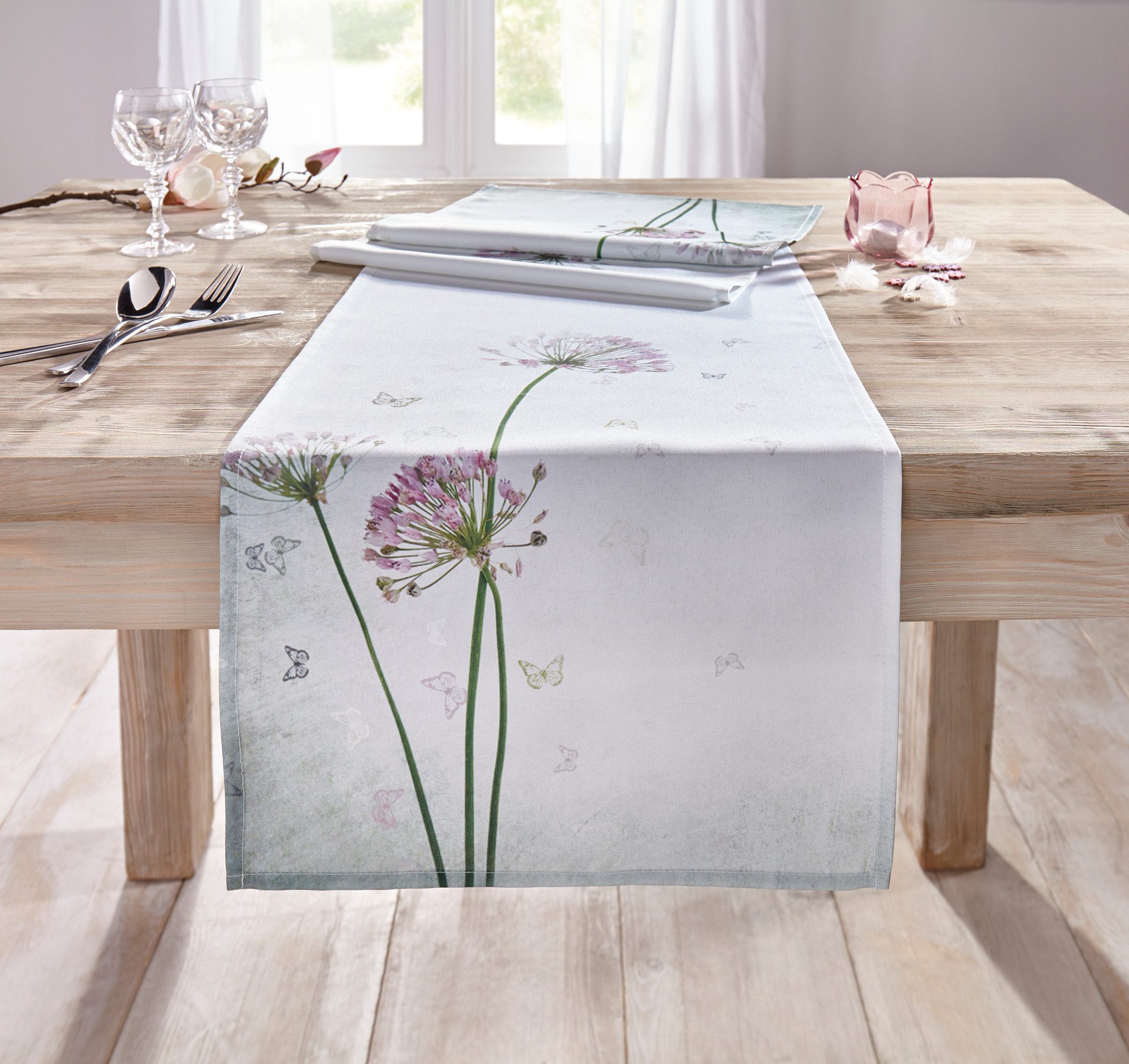 Verleihen Sie Ihrem Tisch mit dem Tischläufer "Allium" eine frische und einladende Note. Dieser elegante Läufer ist perfekt für Ihr Wohnzimmer, Esszimmer, die Terrasse oder den Balkon und bringt das Flair des Frühlings in Ihre Räume.
