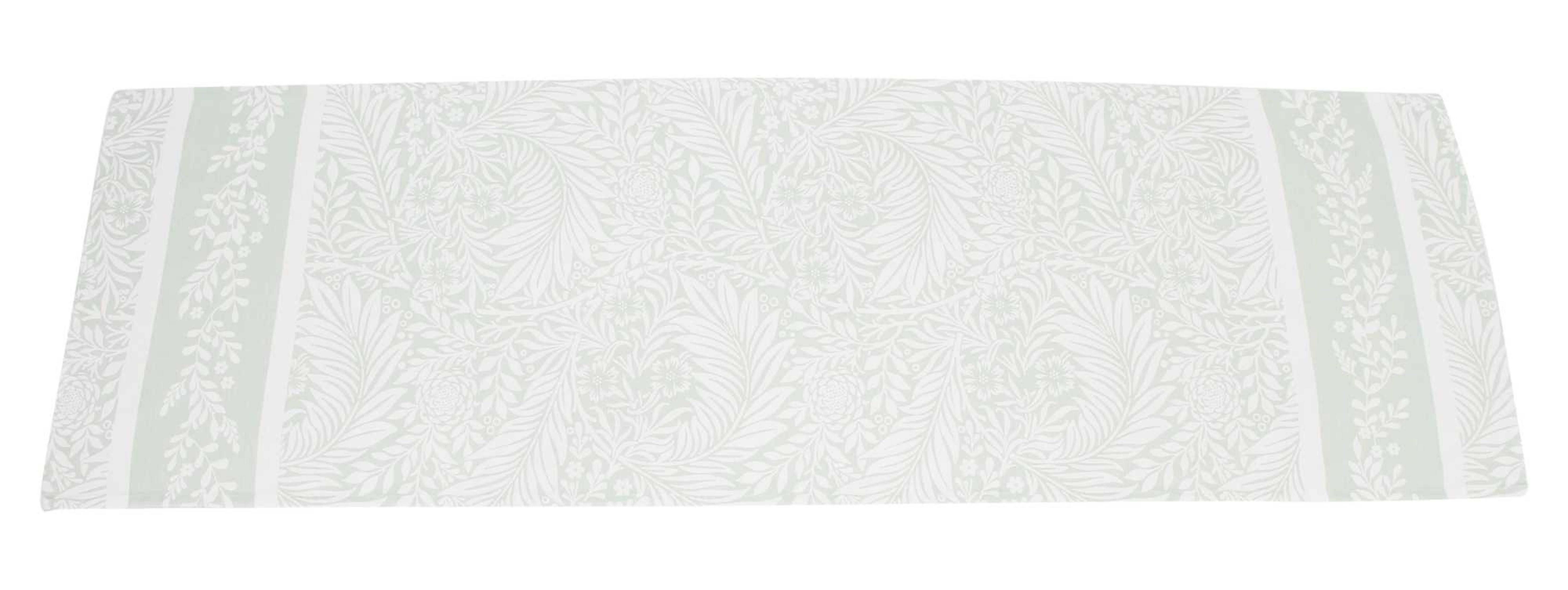 Tischläufer "Flora": Frischer Wind für Ihren Tisch. Eleganter, weißer Grundstoff mit mintgrünem Design. 50% Baumwolle, 50% Polyester. Stil & Funktionalität.