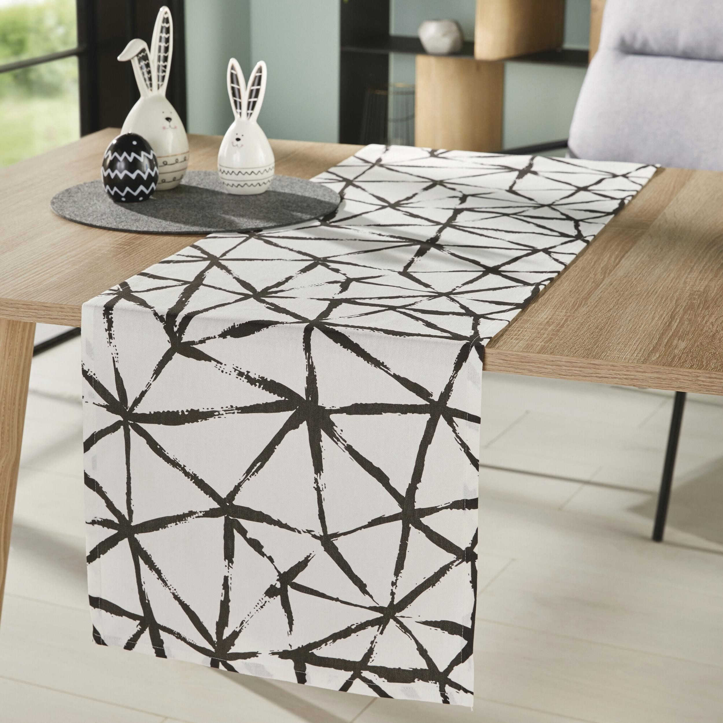 Tischläufer "Graphic": Blickfang auf jedem Esstisch. Cremeweißer Grundstoff (100% Baumwolle) mit trendigem Schwarzmuster. Moderne Note für Ihr Esszimmer.