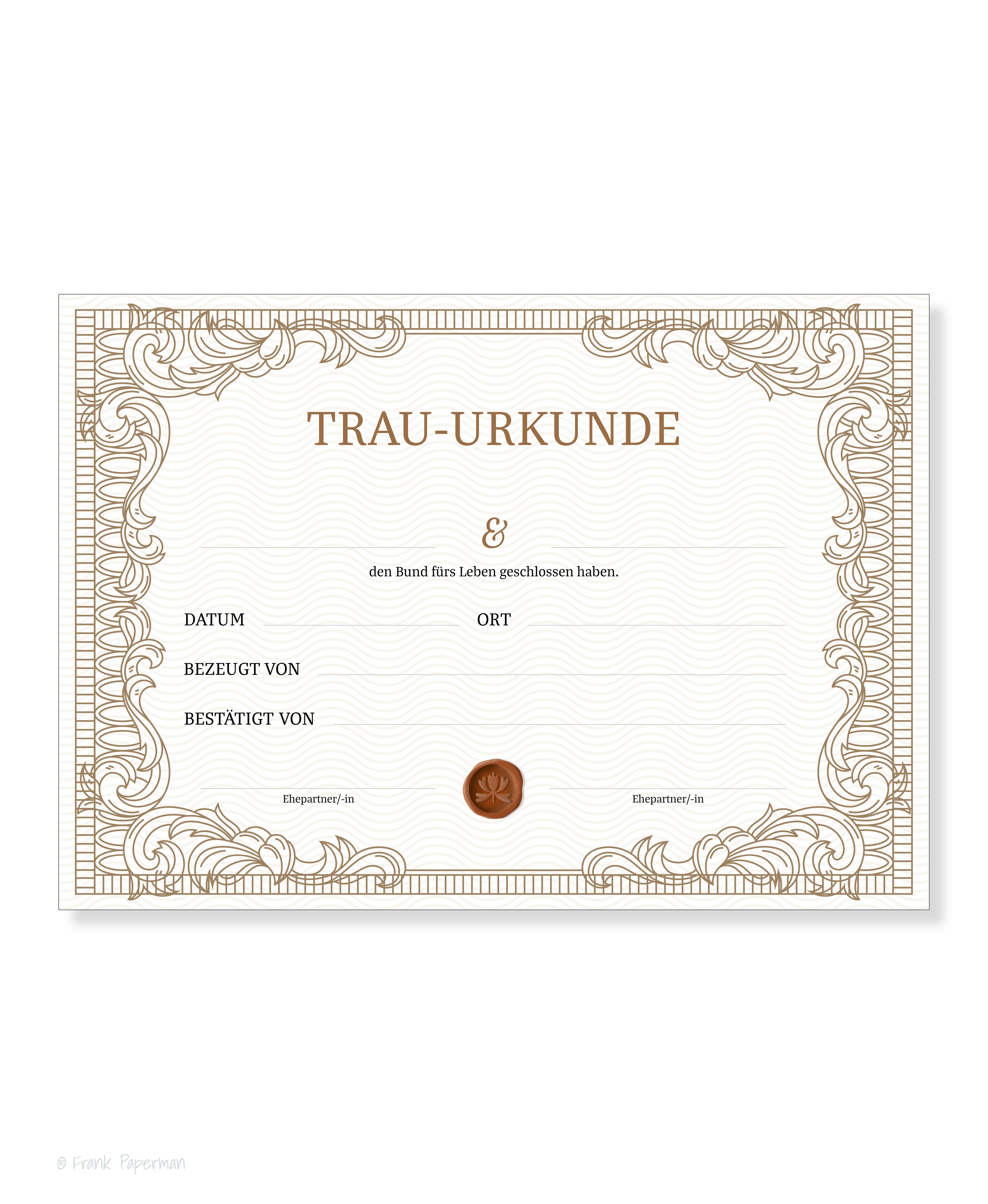 Вариантыn: 1 Trauurkunde | 25 Trauurkunden | 1 Trauurkunde + 2 Trauzeugen-/innenurkunden Eine Hochzeit stellt ein besonderes Ereignis dar, das die Verbindung zwischen zwei Menschen feiert. Sie ist ein bedeutsamer Anlass, der oft mit Liebe, Glück und dem Start eines neuen Lebensabschnitts verbunden ist. Dieser Moment, in dem zwei Menschen sich ihr Versprechen geben, wird gemeinsam mit dem engsten Umfeld gefeiert. Als Gast der Hochzeit möchte man den Eheleuten ein tolles Geschenk mitbringen. Unser Produkt ist eine individuell gestaltete Geschenkidee, die sich optimal als persönliche Geste bzw. als Hochzeitsgeschenke für Brautpaar ausgefallen eignet. Die Urkunde kann als Highlight zur Hochzeit Karte beigelegt werden. Dem Brautpaar wird so eine schöne Erinnerung an ihren großen Tag übergeben. Diese Gratulationskarte Hochzeit ist ideal zum Einrahmen & zum Aufhängen geeignet. Auf der Rückseite der Urkunde findet man alle Ehejubiläen mit entsprechender Bezeichnung. Sehen Sie sich auch unsere anderen Produkte der Kategorie Hochzeit an, indem Sie nach Frank Paperman suchen.