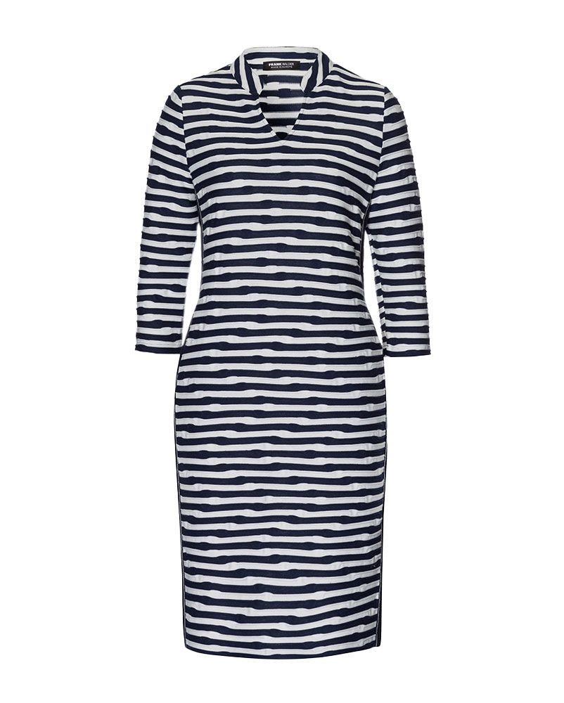 Erleben Sie Mode neu mit diesem Jerseykleid, das klassische Eleganz mit modernem Design verbindet. Das Kleid aus hochwertigem Viskose-Mix-Jersey präsentiert sich mit einem raffinierten Schnitt, der vorteilhaft jede Figur umschmeichelt. Das moderne Streifendessin setzt modische Akzente und macht das Kleid zu einem vielseitigen Begleiter für diverse Anlässe. Mit einem kleinen V-Ausschnitt, Stehbund und praktischen Eingrifftaschen bietet es einen komfortablen Tragekomfort.
