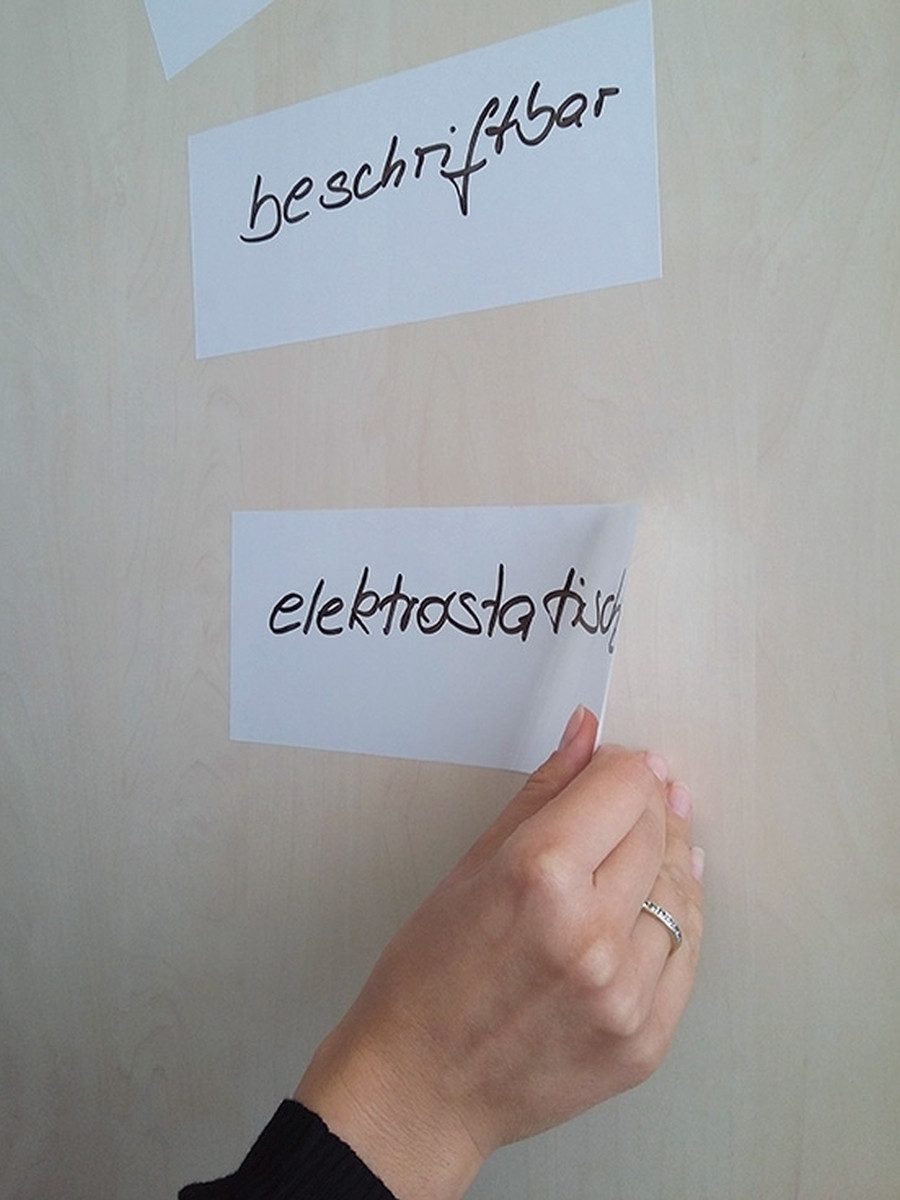 • Text des Aufdruckes hinten: elektrostatisch, selbsthaftend und rückstandslos abziehbar