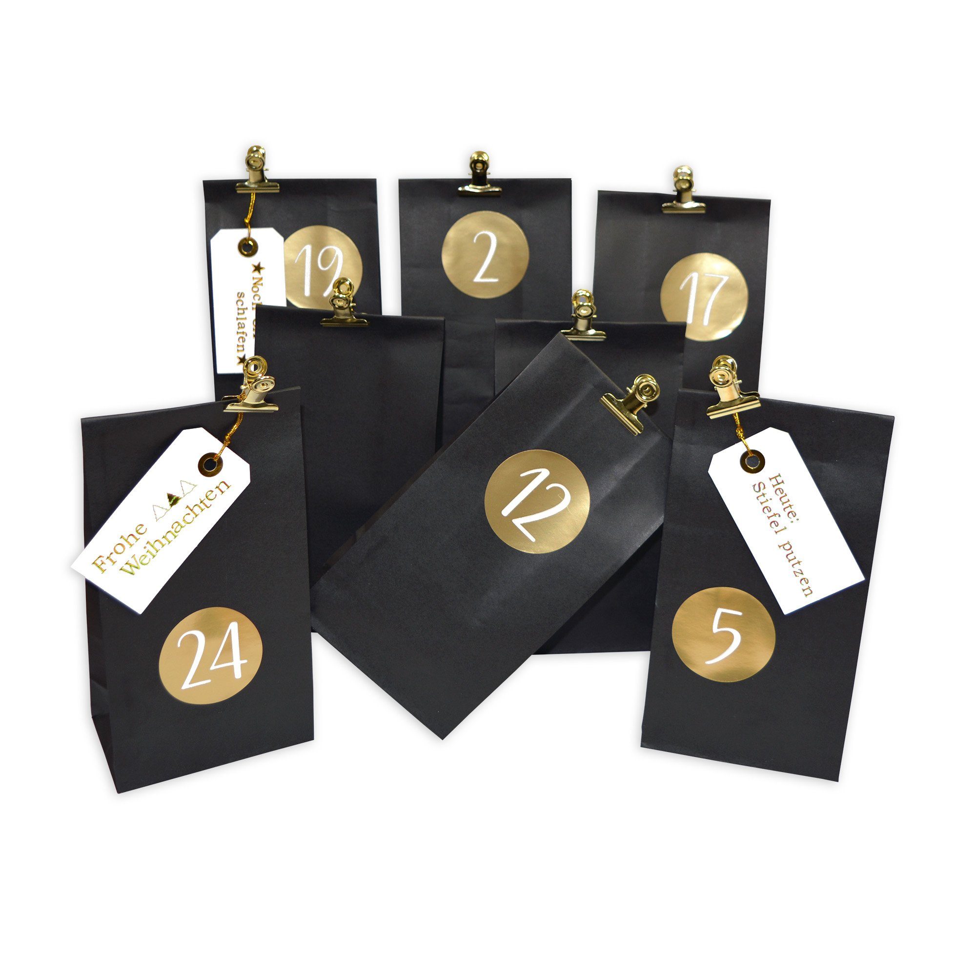 Inhalt 24 Blockbodenbeutel aus 100 Gramm Papier 24 Metallklammern 24 Adventskalenderzahlen Aufkleber XL Ø 6cm 4 Anhaenger mit Aufdruck: Heute Stiefel putzen (5. Dez.), Nikolaus (6. Dez.), Noch 5x schlafen (19. Dez) und Frohe Weihnachten (24. Dez.) 3 Meter goldenes Band