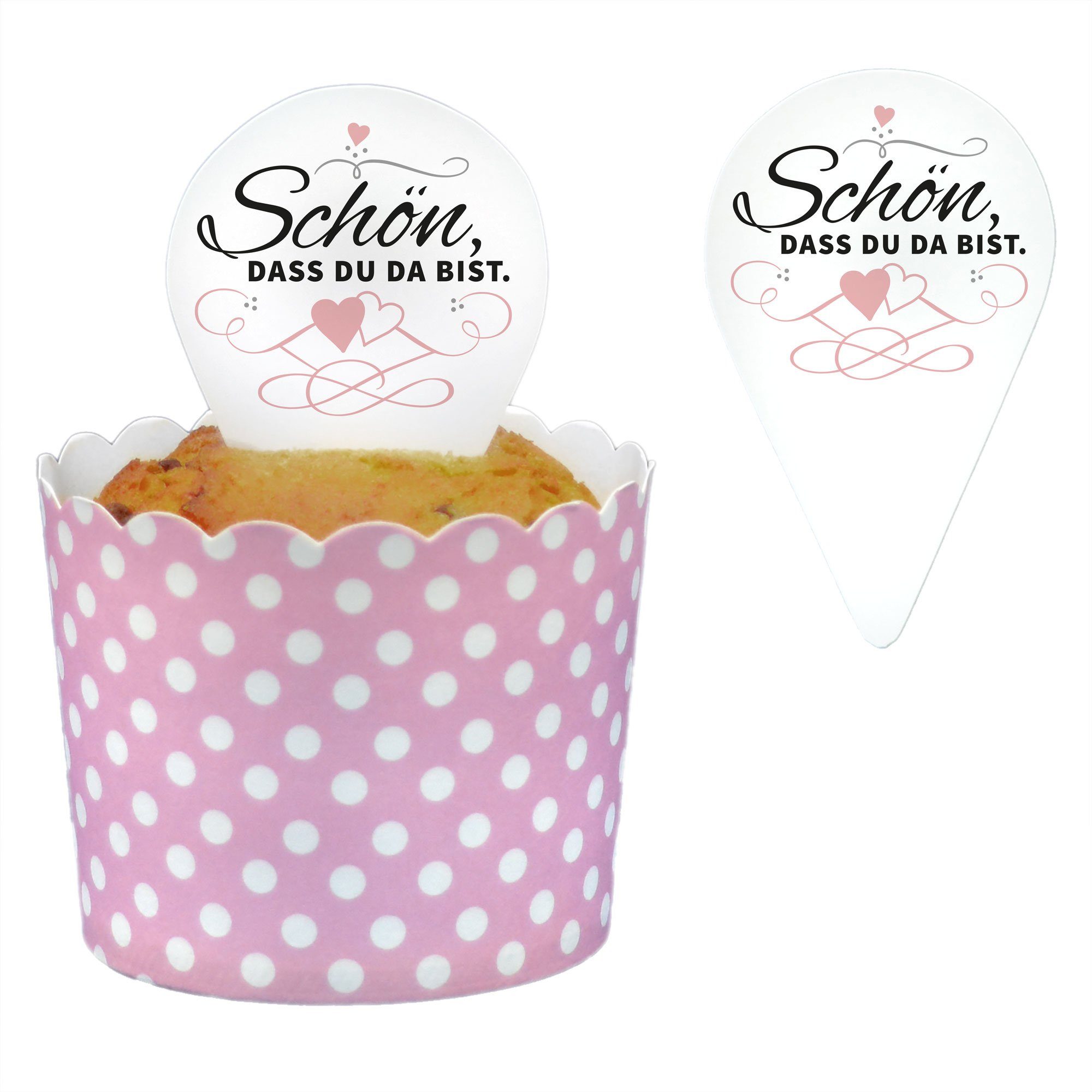 24 süße Frau Wundervoll Topper. Lebensmittelecht und somit ideal um Muffins, Cupcakes und Kuchen zu verschönern. Das Design der Topper wurde liebevoll im Hause Wundervoll gestaltet. Die Topper sind von beiden Seiten bedruckt und mit einer lebensmittelechten Schutzschicht versehen. Durch die Schutzschicht bleiben die Topper länger Fett- und Ölabweisend, im Vergleich zu normalem, unbeschichteten Papier. Die Topper haben eine Höhe von 7 cm und eine Breite von 4 cm. Sie lassen sich ideal mit den kleinen und großen Frau Wundervoll Muffin Backformen kombinieren. Ein hübscher Hingucker für deinen nächsten Kaffeeklatsch, Geburtstag oder Familienfeier. Inhalt 24 Topper Размер Höhe 7 cm Breite 4 cm