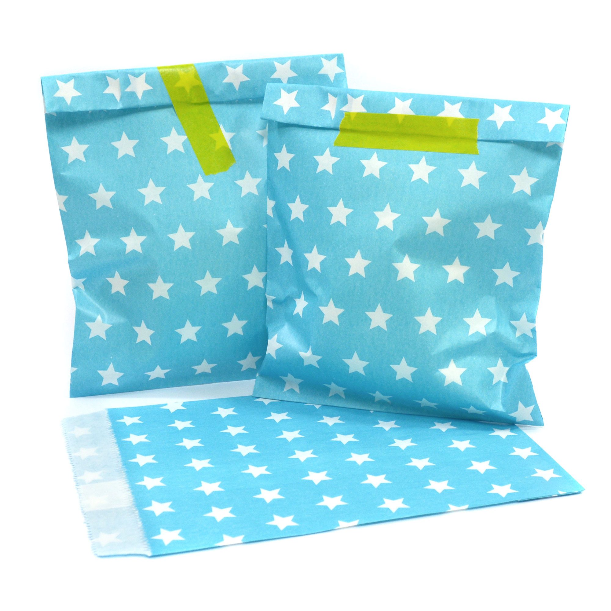 Flache, unbeschichtete Papiertueten in vielen verschiedenen leuchtenden Farben und liebevollen Designs