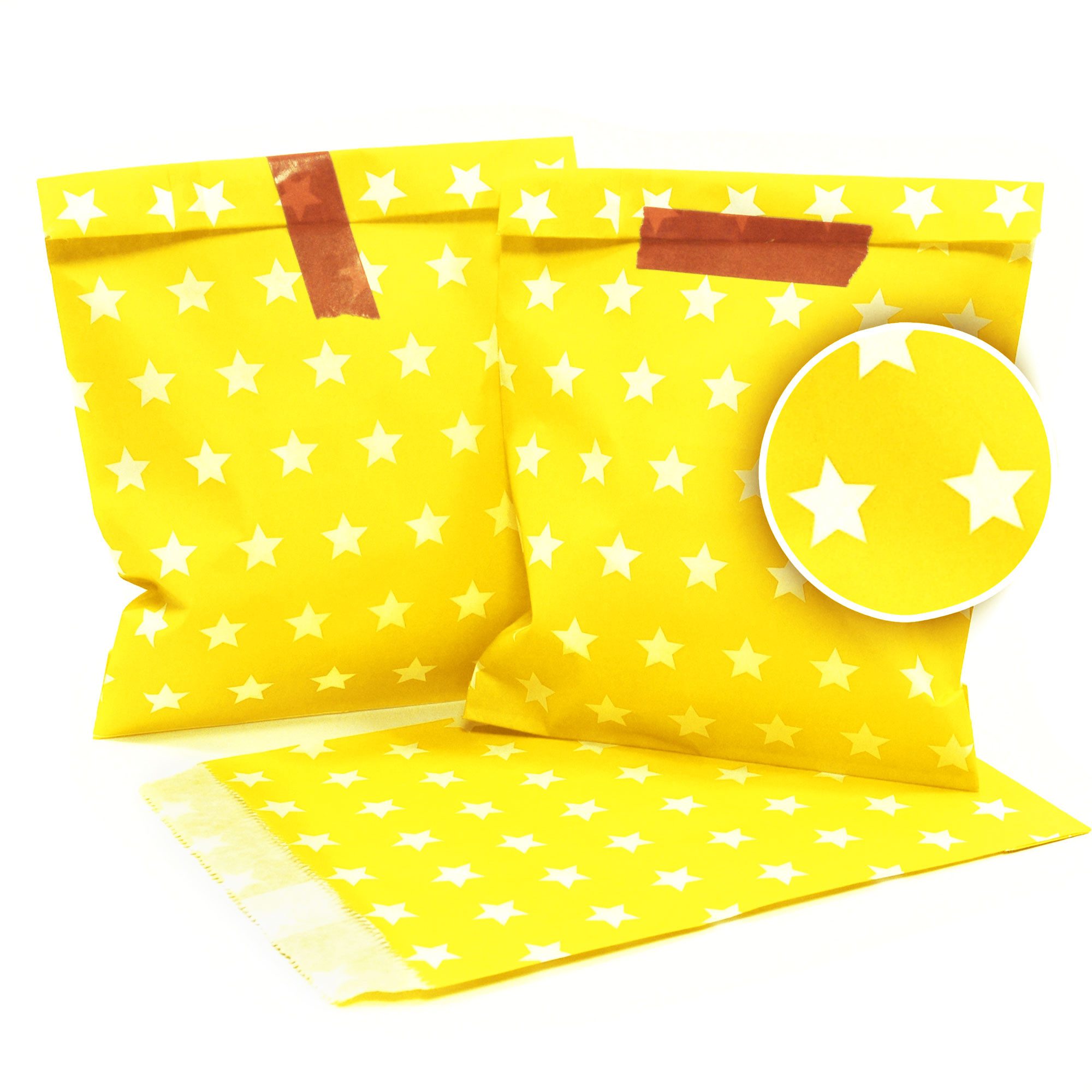 Flache, unbeschichtete Papiertueten in vielen verschiedenen leuchtenden Farben und liebevollen Designs