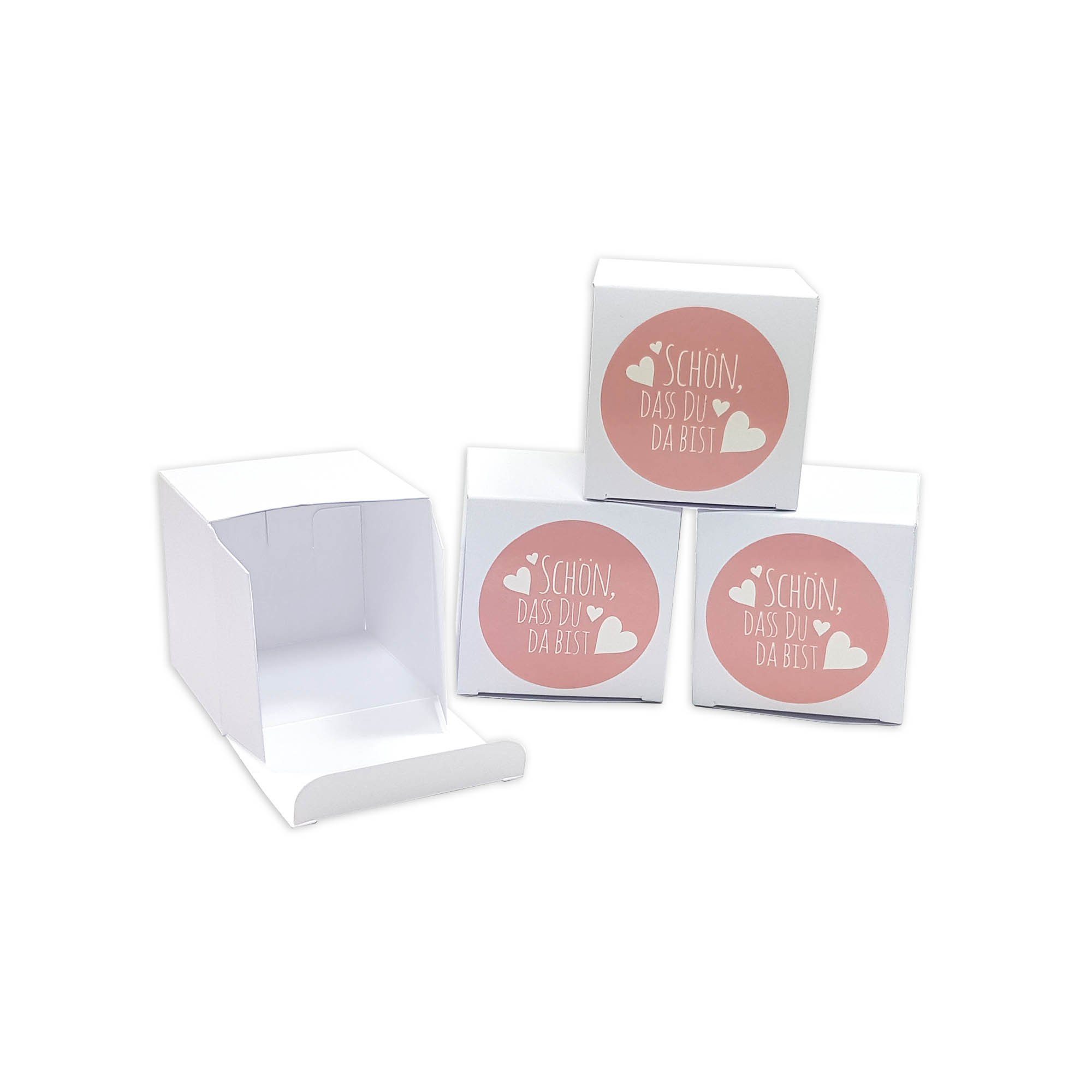 24 Frau Wundervoll Gastgeschenk Verpackungen bestehend aus: 24 weißen Faltschachteln aus stabilem Naturpapier (250 Gramm) und 24 rosa Aufklebern Schön, dass du da bist