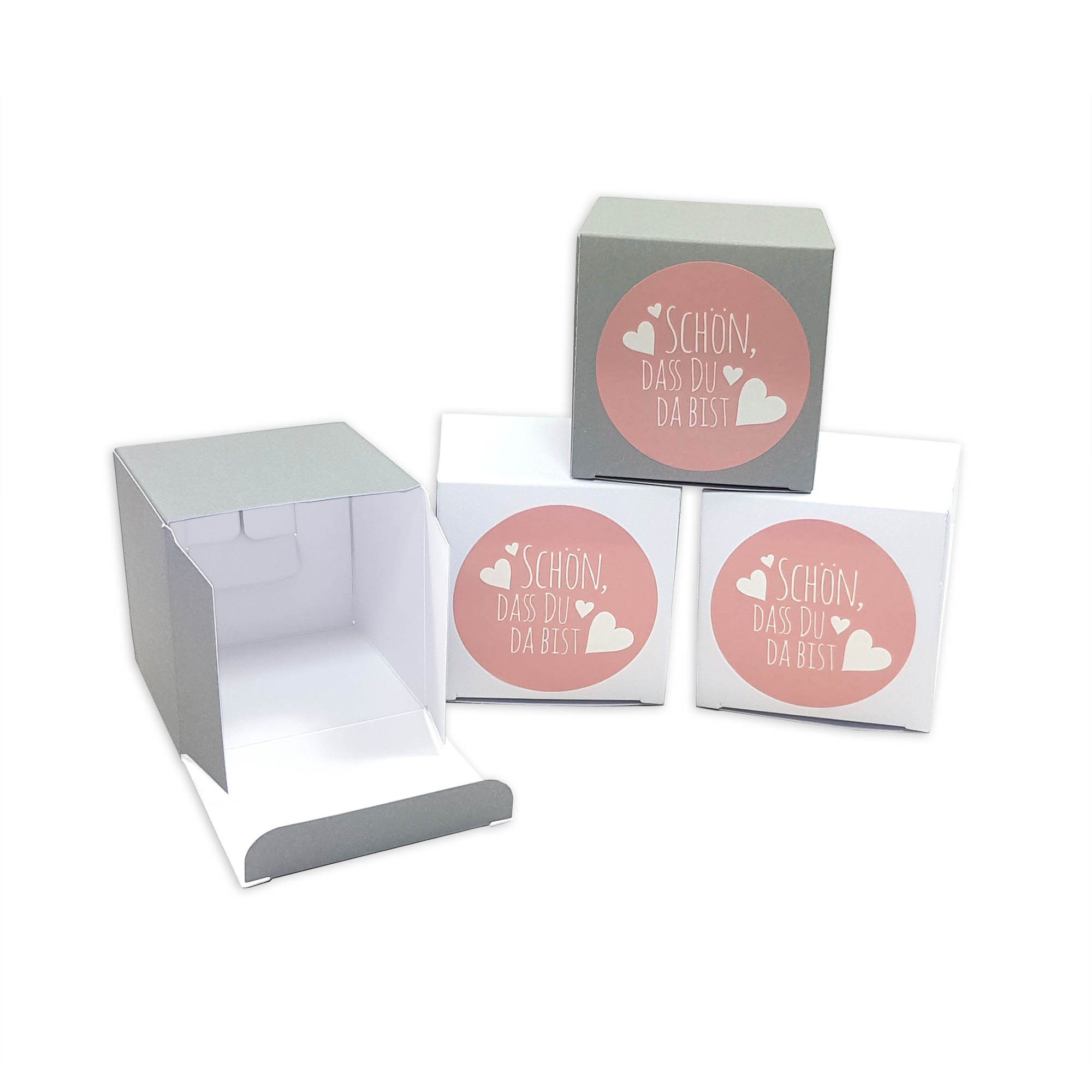 Frau WUNDERVoll® 12 weiße und 12 graue Faltschachteln plus 24 rosa Aufkleber Schön, dass du da bist. Eine hübsche Verpackung für Gastgeschenke. Schachteln aus Naturpapier (250 Gramm). Ideal zum Verpacken von kleinen Aufmerksamkeiten. Die Schachteln haben eine Fläche (gefaltet) von 7 x 7 x 7 cm. Die Aufkleber haben einen Durchmesser von 4 cm.