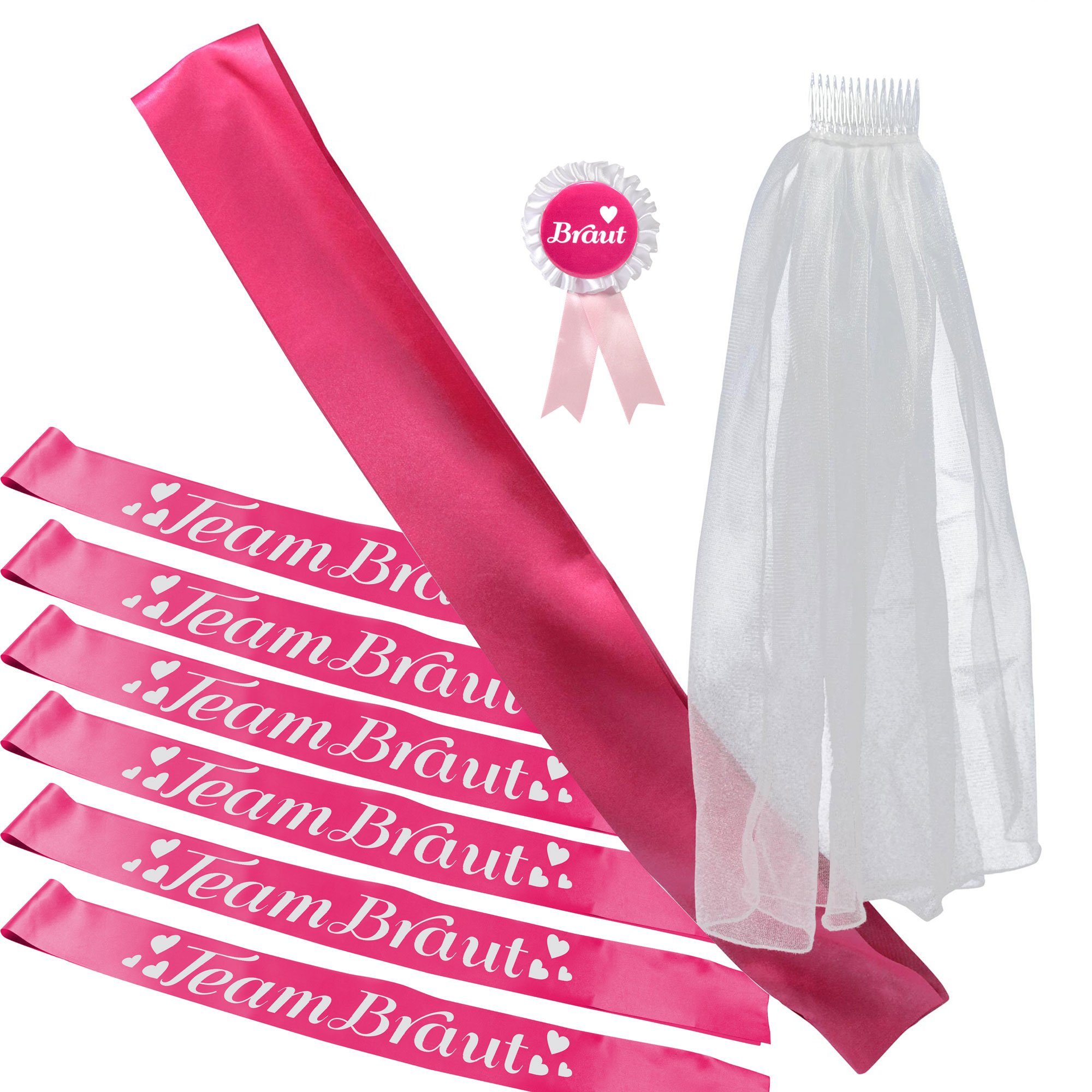 Das Frau Wundervoll JGA Gruppenset Premium eignet sich für 1 Braut und 6 Freundinnen. Für die Braut ist ein Schleier, eine unifarbene Schärpe und ein süßer Brautorden enthalten. Des Впередen enthält das Gruppenset 6 bedruckten Schärpen für die Freundinnen der Braut. Schwarz angezogen, in Kombination mit diesen Accessoires wird Eure Gruppe zum Hingucker des Abends. Lasst es krachen Mädels! Accessoires für die Braut Der Schleier ist ca. 48 cm lang und hat eine Breite von ca.70 cm. Der eingearbeitete Haarkamm ist 7 cm lang, mit mehr als 10 Zacken, für einen festen Halt im Haar. Die Schärpe ist 80 cm lang und ca. 10 cm breit. Sie ist am unteren Ende vernäht. Der Orden hat einen Durchmesser von 8 cm inkl. der Rüschenumrandung. Auf dem Orden ist ein Button mit der Aufschrift Braut aufgeklebt, mit einbem Durchmesser von 5,6 cm. Auf der Rückseite des Ordens befindet sich eine eingearbeitete Sicherheitsnadel, zum Anstecken an die Schärpe. Accessoires für 6 Freundinnen Die 6 Schärpen mit Aufdruck haben eine Длина von 80 cm und eine Breite von 10 cm. Sie sind am unteren Ende vernäht. Inhalt 1Schleier, 1 unifarbene Brautschärpe, 1 Brautorden, 6 bedruckte Schärpen Размер Schleier: Длина ca. 48 cm, Breite ca. 70 cm. Длина Haarkamm 7 cm, mit 14 Zacken Brautorden: Ø inkl. Rüschen = 8 cm, Ø eingearbeiteter Braut Button = 5,6 cm, Длина Bänder = Ca. 8 cm Braut Schärpe: Длина = 80 cm, Breite = 10 cm Bedruckte Schärpen für Freundinnen: Длина = 80 cm, Breite = 10 cm
