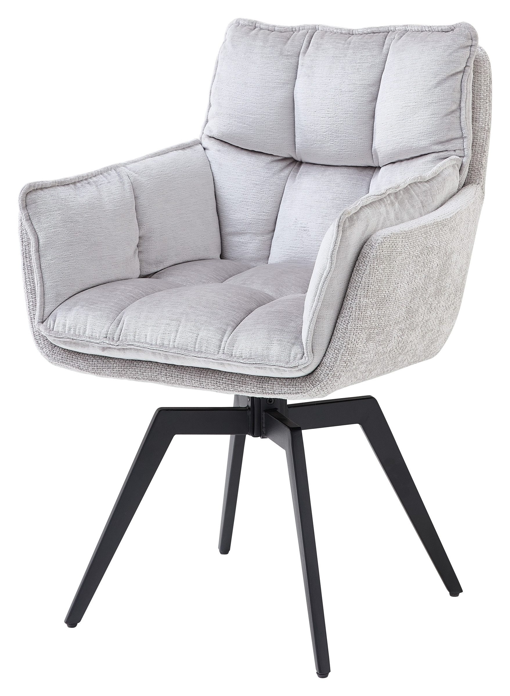 Der Armlehnstuhl Alani kombiniert stilvolles Design mit hervorragendem Komfort und Funktionalität. Mit einer großzügigen Breite von 64 cm, einer Höhe von 89 cm und einer Tiefe von 65,5 cm bietet er ausreichend Platz und eine angenehme Sitzposition. Der Bezug aus Samt- und Mikrofaser in silberner Farbe verleiht dem Stuhl eine elegante Optik und ein weiches, luxuriöses Gefühl. Das Spider Gestell aus schwarzem Metall ist nicht nur stabil, sondern ermöglicht auch eine praktische 180-Grad-Drehung mit Auto-Return-Funktion. Die Sitzhöhe von 52 cm sorgt für eine bequeme Sitzhaltung am Esstisch oder im Wohnzimmer. Der Lieferzustand des Stuhls ist zerlegt, was eine einfache Montage gewährleistet. Ideal als 2er Set erhältlich, um Ihren Raum stilvoll zu ergänzen und zu verschönern.