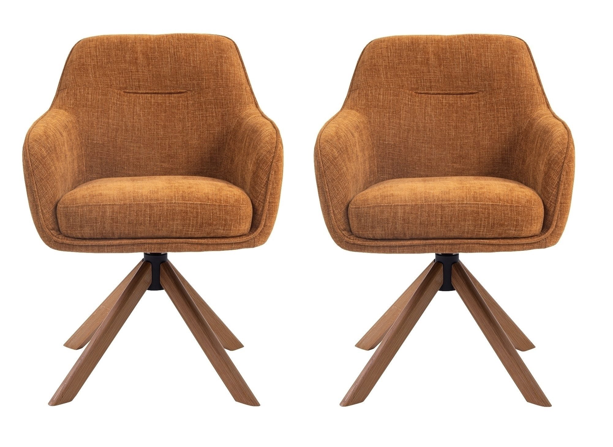 Der Armlehnstuhl Avola bietet mit seiner 360° drehbaren Sitzschale und der automatischen Rückstellfunktion höchsten Komfort. Die ergonomisch geformte Sitzfläche mit Taschenfederkern ermöglicht entspanntes Sitzen über Stunden. Mit einer Sitzhöhe von 51,5 cm, einer Sitzbreite von 45 cm und einer Sitztiefe von 45 cm ist der Stuhl ideal für verschiedene Körpergrößen geeignet. Die Armlehnen auf 66 cm Höhe sorgen für zusätzlichen Halt und Bequemlichkeit. Die robuste Konstruktion aus Massivholz gewährleistet eine maximale Belastbarkeit von 110 kg. Der Bezug des Avola besteht aus 100% Polyester und überzeugt mit einer hochwertigen Chenille-Optik. Der leichte Antik-Effekt verleiht dem Stuhl eine besondere Ästhetik, die sowohl moderne als auch klassische Wohnstile ergänzt. Mit einer Scheuerbeständigkeit von 25.000 Scheuertouren nach der Martindale-Methode ist der Stoff äußerst strapazierfähig und langlebig. Die rostfarbene Gestaltung bringt eine warme Atmosphäre in jedes Ess- oder Wohnzimmer. Das moderne Spidergestell des Armlehnstuhls Avola ist aus hochwertigem Massivholz gefertigt und harmoniert perfekt mit den rostfarbenen Bezügen. Die Beine in Eiche setzen stilvolle Akzente und bieten eine stabile Basis für den Sitzkomfort. Dank der durchdachten Konstruktion bleibt der Stuhl auch nach längerem Gebrauch formstabil und zuverlässig. Mit seinen Maßen von 57 cm Breite, 87 cm Höhe und 65 cm Tiefe passt er ideal an Esstische oder in gesellige Sitzbereiche. Der Armlehnstuhl Avola wird zerlegt geliefert, sodass er sich platzsparend transportieren lässt. Die Montage ist mit wenigen Handgriffen erledigt und leicht verständlich. Dank der hochwertigen Verarbeitung und der robusten Materialien ist der Stuhl eine langlebige Investition in den Wohnkomfort. Ob im Esszimmer, Büro oder Wohnzimmer – der Avola überzeugt mit seinem edlen Design, seiner Funktionalität und seiner komfortablen Polsterung.