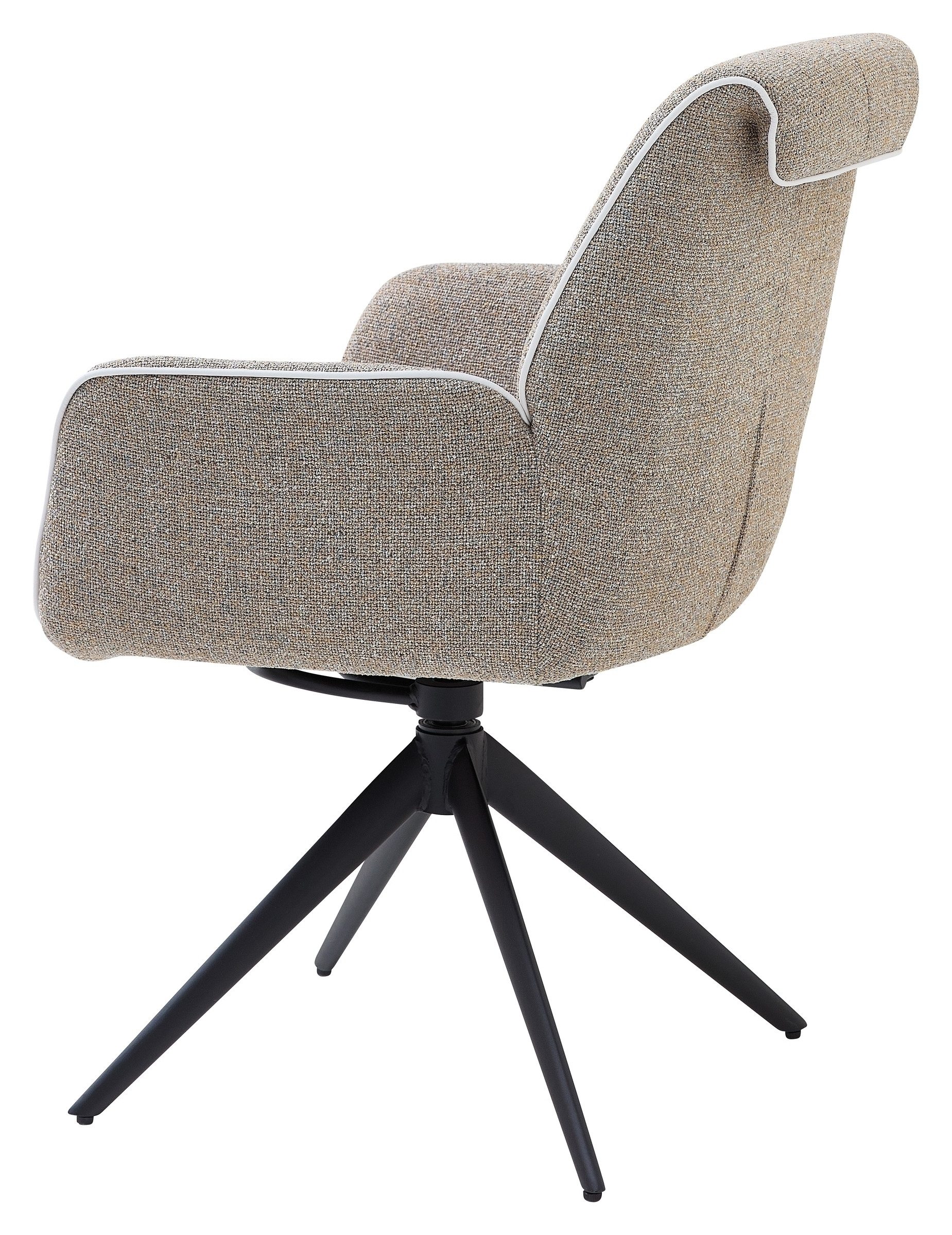 Der Armlehnstuhl Enja verbindet modernes Design mit hoher Funktionalität und Komfort. Im praktischen 2er Set geliefert, bietet er nicht nur stilvolle Akzente in Ihrem Esszimmer, sondern auch durchdachte Details für ein angenehmes Sitzgefühl. Mit den Maßen B/H/T: 64/92/65 cm und einer Sitzhöhe von 48 cm ist der Stuhl großzügig proportioniert und ermöglicht bequemes Sitzen. Der Bezug aus hochwertigem Strukturstoff in elegantem Taupe sorgt für ein edles Erscheinungsbild und eine angenehme Haptik, die sich zudem leicht reinigen lässt. Das robuste Gestell aus schwarzem Metall garantiert Stabilität, Langlebigkeit und einen modernen Look, der sich harmonisch in viele Einrichtungsstile einfügt. Ein besonderes Highlight des Armlehnstuhls ist die 360° Drehfunktion mit Auto-Return. Diese erlaubt maximale Bewegungsfreiheit und sorgt dafür, dass sich der Stuhl nach dem Aufstehen automatisch wieder in die Ausgangsposition dreht – perfekt für flexibles Sitzen im Alltag. Das Design wird durch eine Griffmulde an der Rückenlehne ergänzt, die das Verschieben des Stuhls erleichtert und zugleich ein ästhetisches Detail darstellt. Der weiße Keder am Bezug setzt einen stilvollen Akzent und unterstreicht die hochwertige Verarbeitung. Der Armlehnstuhl Enja wird zerlegt geliefert, was eine platzsparende Anlieferung ermöglicht. Die Montage gestaltet sich dank der beiliegenden Anleitung einfach und schnell. Zusammengefasst bietet der Armlehnstuhl Enja eine gelungene Kombination aus zeitgemäßem Design, praktischem Komfort und langlebigen Materialien. Er ist die ideale Wahl für alle, die ihr Esszimmer mit stilvollen, funktionalen Möbeln ausstatten möchten.