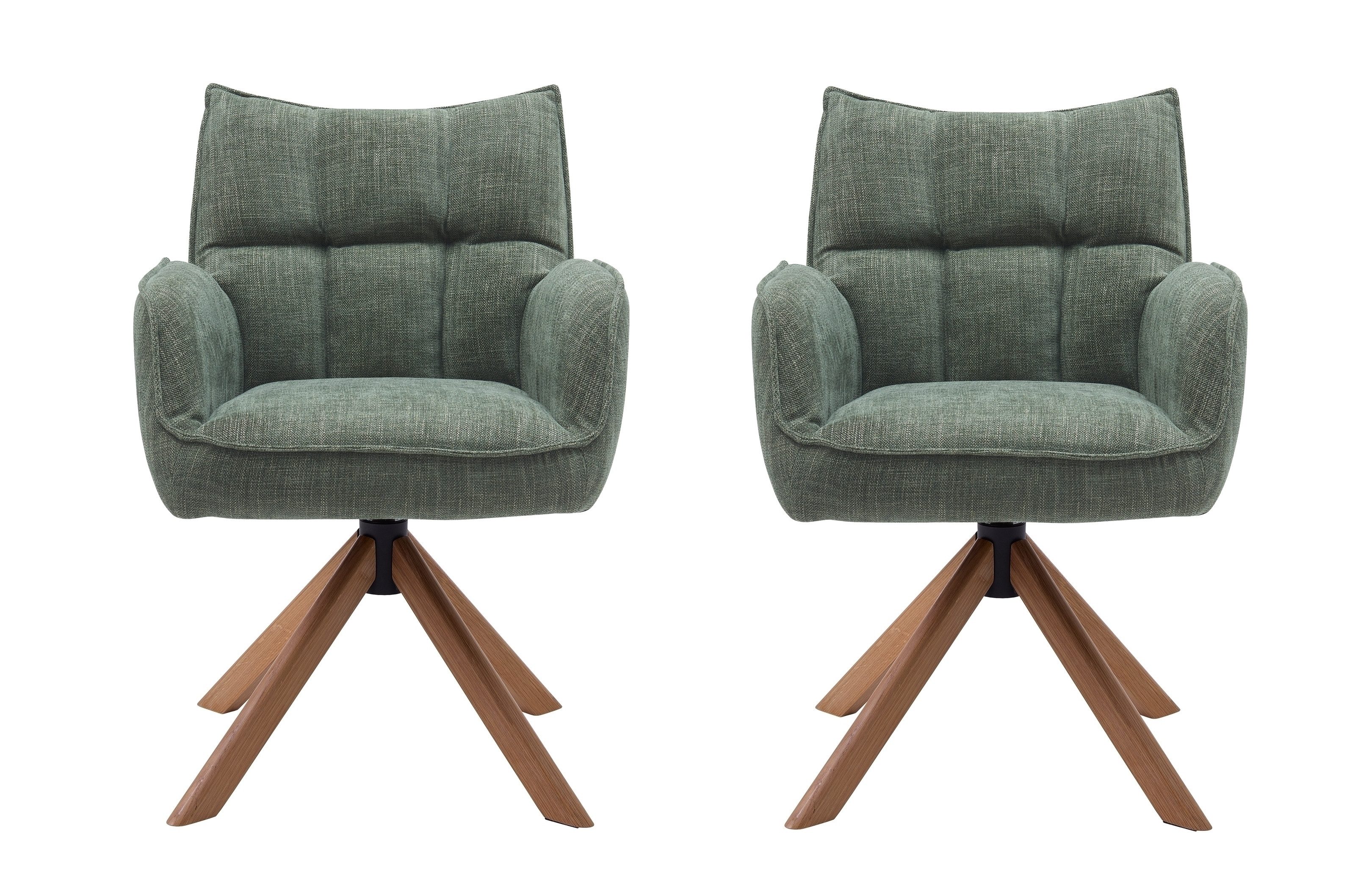 Der Armlehnstuhl Marilla vereint klassischen Komfort mit modernem Design. Seine großzügigen Maße von 59/86/65 cm (B/H/T) bieten eine komfortable Sitzfläche mit einer Sitzhöhe von 50,5 cm, ideal für längere Abende am Esstisch oder im Wohnbereich. Die Rückenlehne mit stilvoller Waffelsteppung und die weich gepolsterte Sitzschale mit Taschenfederkern sorgen für ein angenehmes Sitzgefühl. Die 360° drehbare Sitzfläche mit automatischer Rückführung erleichtert das Aufstehen und Hinsetzen, was Marilla auch funktional zu einem Highlight macht. Der Bezug aus 100 % Polyester besitzt einen eleganten Chenille-Touch mit einem dezenten antiken Effekt – robust, pflegeleicht und optisch sehr ansprechend. Dank seiner Scheuerbeständigkeit von über 25.000 Scheuertouren nach Martindale ist Marilla besonders langlebig und für den täglichen Einsatz bestens geeignet. Die warme Farbe Waldgrün unterstreicht die edle Optik und bringt Natürlichkeit in jeden Raum. Ob modern oder klassisch eingerichtet – Marilla fügt sich harmonisch ein. Das stabile Spidergestell aus FSC-zertifiziertem Massivholz in Eiche verleiht dem Armlehnstuhl Marilla einen sicheren Stand und eine besondere optische Note. Die Kombination aus natürlichem Holz und samtigem Stoffbezug macht Marilla zu einem Hingucker in jeder Einrichtung. Die Armlehnenhöhe von 65 cm unterstützt eine entspannte Sitzhaltung und fördert ergonomisches Sitzen. Dank durchdachter Proportionen eignet sich Marilla auch für kleinere Räume, ohne auf Komfort zu verzichten. Der Stuhl Marilla wird im praktischen 2er-Set geliefert und kommt zerlegt bei Ihnen an. Eine detaillierte Aufbauanleitung liegt bei, sodass der Aufbau unkompliziert und schnell vonstattengeht. Mit einem Gewicht von 11,3 kg ist der Stuhl robust, aber dennoch gut zu handhaben. Ob im Esszimmer, in der Leseecke oder im Homeoffice – Marilla überzeugt durch Komfort, Funktion und Design auf ganzer Linie. Das Modell vereint Qualität und Stil in einem durchdachten Gesamtpaket.
