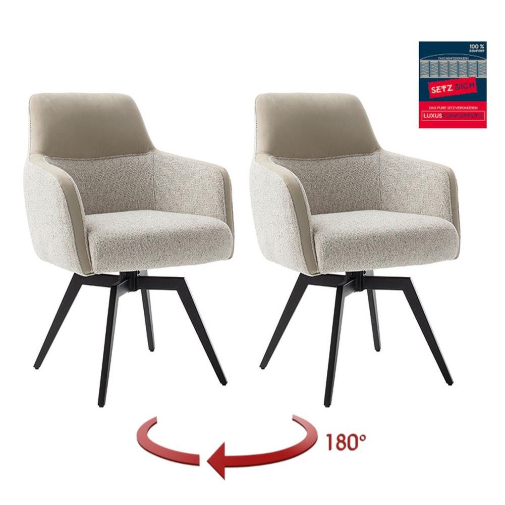 Der MILAGRO 4-Fuß Stuhl mit Armlehnen vereint stilvolles Design und höchsten Sitzkomfort. Die elegante Struktur des Gewebes im Vintagelook verleiht Ihrem Wohn- oder Essbereich eine moderne und zugleich gemütliche Atmosphäre. Die Kombination aus schwarzem, matt lackiertem Gestell und hochwertigen Materialien macht diesen Stuhl zu einem echten Blickfang. Für optimalen Komfort sorgt der integrierte Taschenfederkern-Luxussitz, der sich perfekt an Ihre Sitzposition anpasst und selbst bei längerem Sitzen höchsten Komfort bietet. Dank der 180°-Drehfunktion mit integrierter Nivellierung genießen Sie Flexibilität und Bewegungsfreiheit. Der Stuhl ist bis maximal 120 kg belastbar und bietet somit Stabilität und Langlebigkeit. Mit kompakten Maßen von 63 cm Breite, 89 cm Höhe und 64 cm Tiefe passt der MILAGRO Stuhl in nahezu jedes Raumkonzept. Die Sitzfläche bietet mit einer Breite von 47 cm, einer Höhe von 52 cm und einer Tiefe von 45 cm optimalen Platz für bequemes Sitzen. Trotz seines robusten Designs wiegt der Stuhl nur 11 kg und ist zerlegt in einer Verpackungseinheit von zwei Stück leicht zu transportieren und zu montieren.