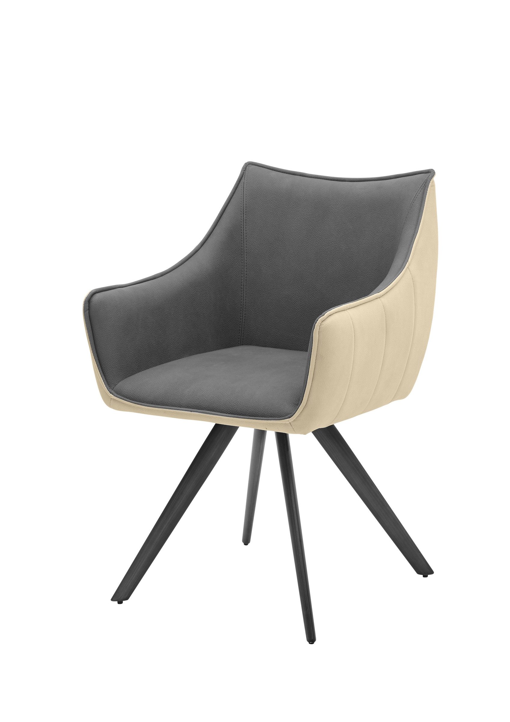 Bezug aus grauer und beiger Mikrofaser, robust und pflegeleicht, kombiniert mit schwarzem lackiertem Metallgestell für moderne Optik und Stabilität.