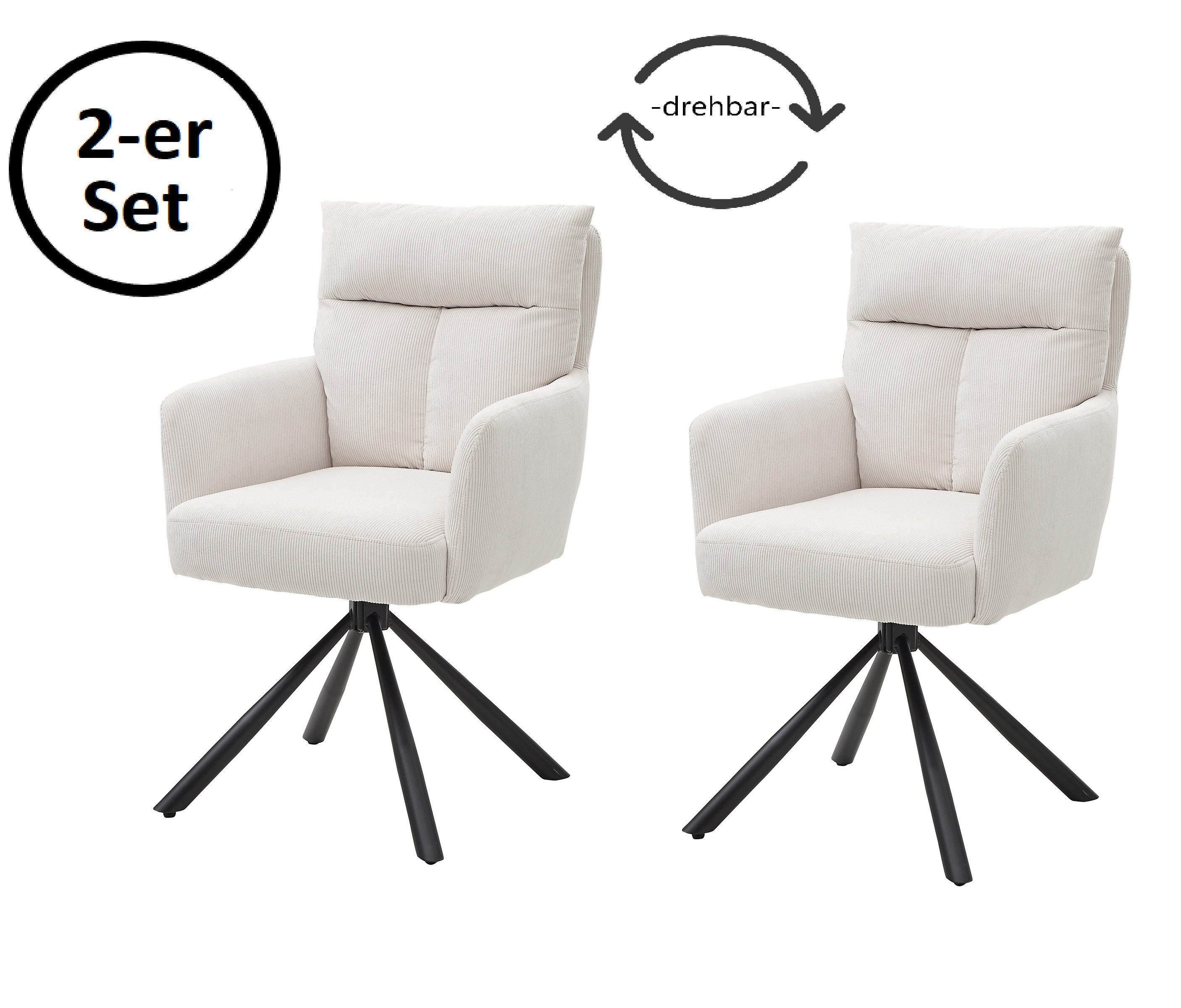 Der Solveig Armlehnstuhl verbindet zeitloses Design mit höchstem Sitzkomfort und setzt dabei auf hochwertige Materialien und moderne Funktionalität. Mit Abmessungen von 60 x 51,2 x 95 cm (B/H/T) bietet Solveig nicht nur eine angenehme Sitzfläche, sondern auch einen Blickfang für jeden Raum. Der Bezug aus edlem Cord in der Farbe Beige verleiht dem Stuhl eine warme und einladende Ausstrahlung. Der Cordstoff ist nicht nur angenehm weich, sondern auch strapazierfähig und pflegeleicht. Das 2er-Set zum Sonderpreis macht Solveig zu einer kostengünstigen Möglichkeit, Ihrem Wohnzimmer oder Essbereich ein modernes und gemütliches Flair zu verleihen. Das moderne Spider-Gestell aus schwarzem Metall sorgt für Stabilität und verleiht dem Stuhl eine zeitgemäße Note. Die 180° drehbare Funktion mit Rückholfunktion bietet Flexibilität und macht Solveig zu einem vielseitigen Begleiter für gemütliche Stunden. Der Sitz mit Bonellfederkern gewährleistet nicht nur hohen Sitzkomfort, sondern auch eine optimale Anpassung an die individuelle Körperform. Die beiden Armlehnen komplettieren das Design und steigern den Komfort zusätzlich. Solveig wird zerlegt geliefert, was eine einfache Montage und individuelle Anpassung an Ihren Raum ermöglicht. Holen Sie sich mit Solveig nicht nur einen Stuhl, sondern ein stilvolles Möbelstück, das Ihr Zuhause bereichert.