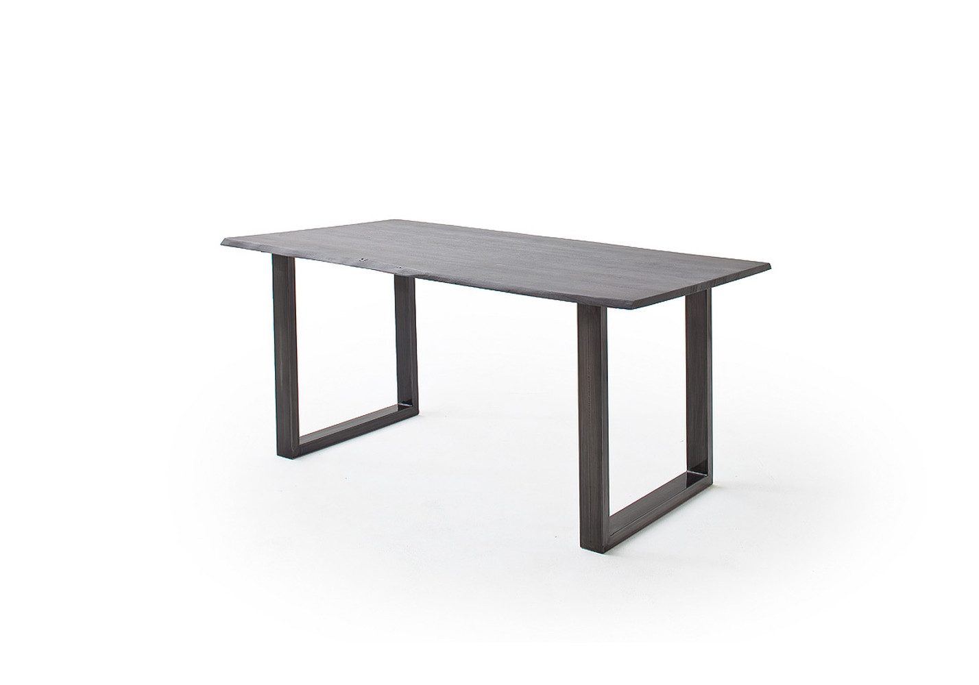 "Der Baumkantentisch ""Calabria"" vereint natürliche Schönheit mit modernem Design. Seine rechteckige Tischplatte aus massiver Akazie strahlt in einer grau lackierten Oberfläche, die durch eine geschickte Lackierung geschützt ist. Das markante Merkmal dieses Tisches ist seine Baumkante, die jedem Exemplar ein einzigartiges Aussehen verleiht. Das robuste Metallgestell in antik gewischt bietet nicht nur eine solide Basis, sondern fügt sich auch perfekt in das zeitgemäße Design ein. Die U-Form der Füße verleiht dem Tisch zusätzliche Stabilität und eine ansprechende Ästhetik. Mit Abmessungen von 160 cm Breite, 90 cm Tiefe und 76,5 cm Höhe bietet der ""Calabria"" genügend Platz für gesellige Runden im Wohnbereich. Dieser Tisch ist nicht nur ein funktionales Möbelstück, sondern auch ein Kunstwerk der Natur. Jedes Exemplar ist aufgrund der einzigartigen Holzmaserung und Baumkante ein Unikat. Mit einem FSC-Zertifikat versehen, können Sie sicher sein, dass das Holz aus nachhaltiger Forstwirtschaft stammt. Der ""Calabria"" wird zerlegt geliefert, um eine einfache Montage zu ermöglichen. Seine stabile Konstruktion und maximale Belastbarkeit von 100 kg machen ihn zu einem zuverlässigen Begleiter für viele Jahre. Perfekt für Liebhaber moderner, natürlicher Einrichtungsstile."