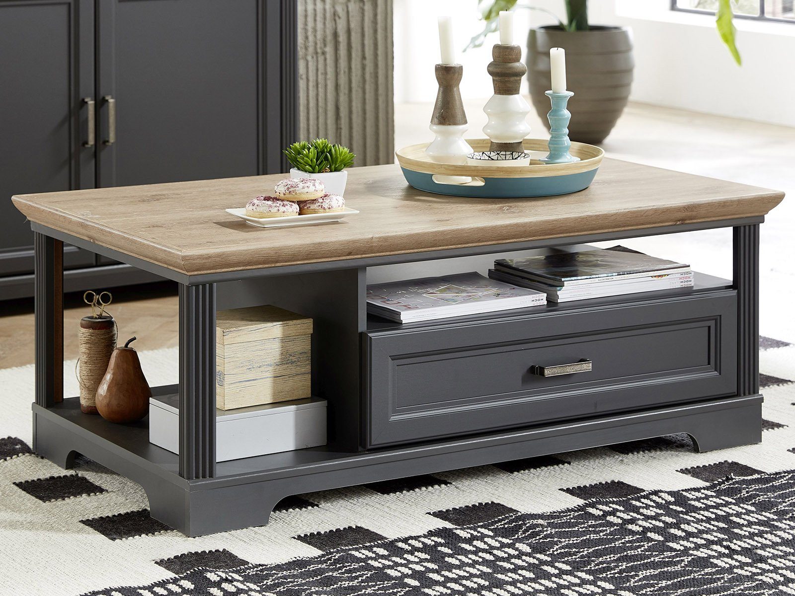 Der Couchtisch "Jasmin I" überzeugt nicht nur mit seiner charmanten Landhaus-Optik, sondern auch in puncto Stauraum. In 1 Schubkasten und 2 offenen Fächern können Kleinigkeiten wie TV-Zeitungen, Fernbedienungen, Snacks usw. griffbereit verstaut werden, wenn der Platz auf dem Tisch anderweitig z. B. für Getränke gebraucht wird. Der Schubkasten verfügt über einen Selbsteinzugs-/Softclose-Mechanismus, welcher ein leises Спрятать gewährleistet.