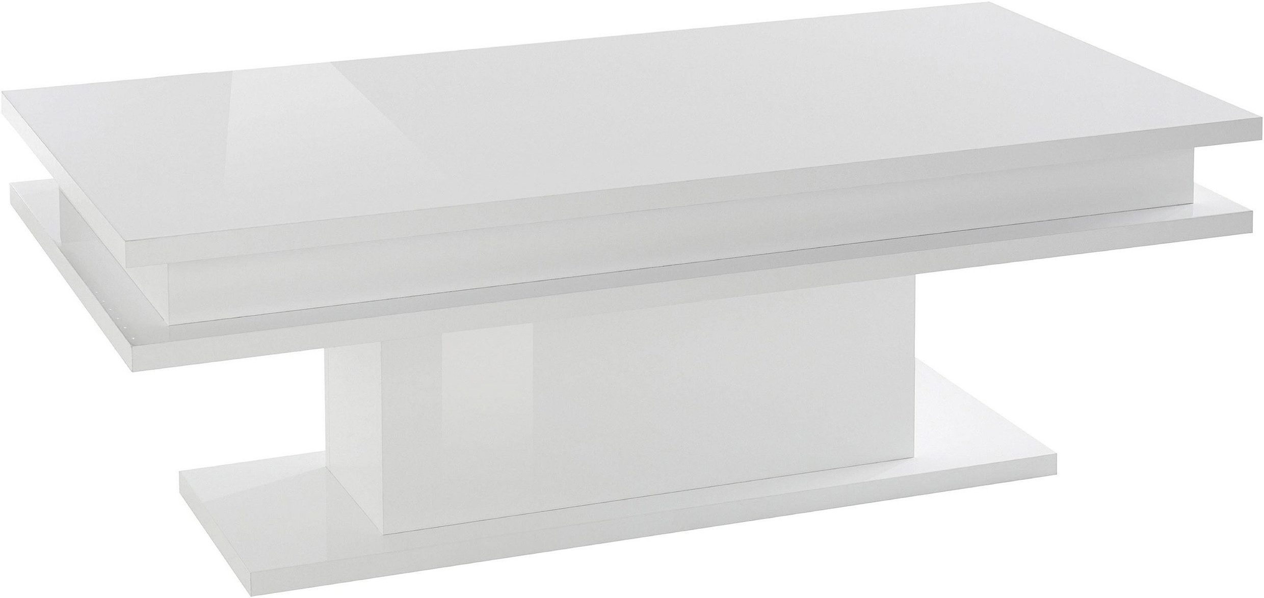 Das elegante Weiß Hochglanz-Finish verleiht dem Couchtisch eine luxuriöse Optik, die das Licht reflektiert und für ein helles Ambiente sorgt.