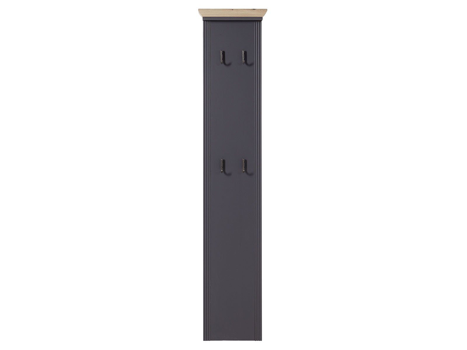 Das Garderobenpaneel "Jasmin I" ist hier in elegantem Graphit gehalten, welches stilsicher mit Absetzungen in vornehmer Artisan Eiche Nachbildung kombiniert wird. Insbesondere in Verbindung mit den antiken Garderobenhaken, sowie den Ausfräsungen der Front wird dem Garderobenpaneel eine ländlich angehauchte, heimelige Erscheinung verliehen. Die Holznachbildung ist qualitativ sehr hochwertig mit täuschend echter Maserung.