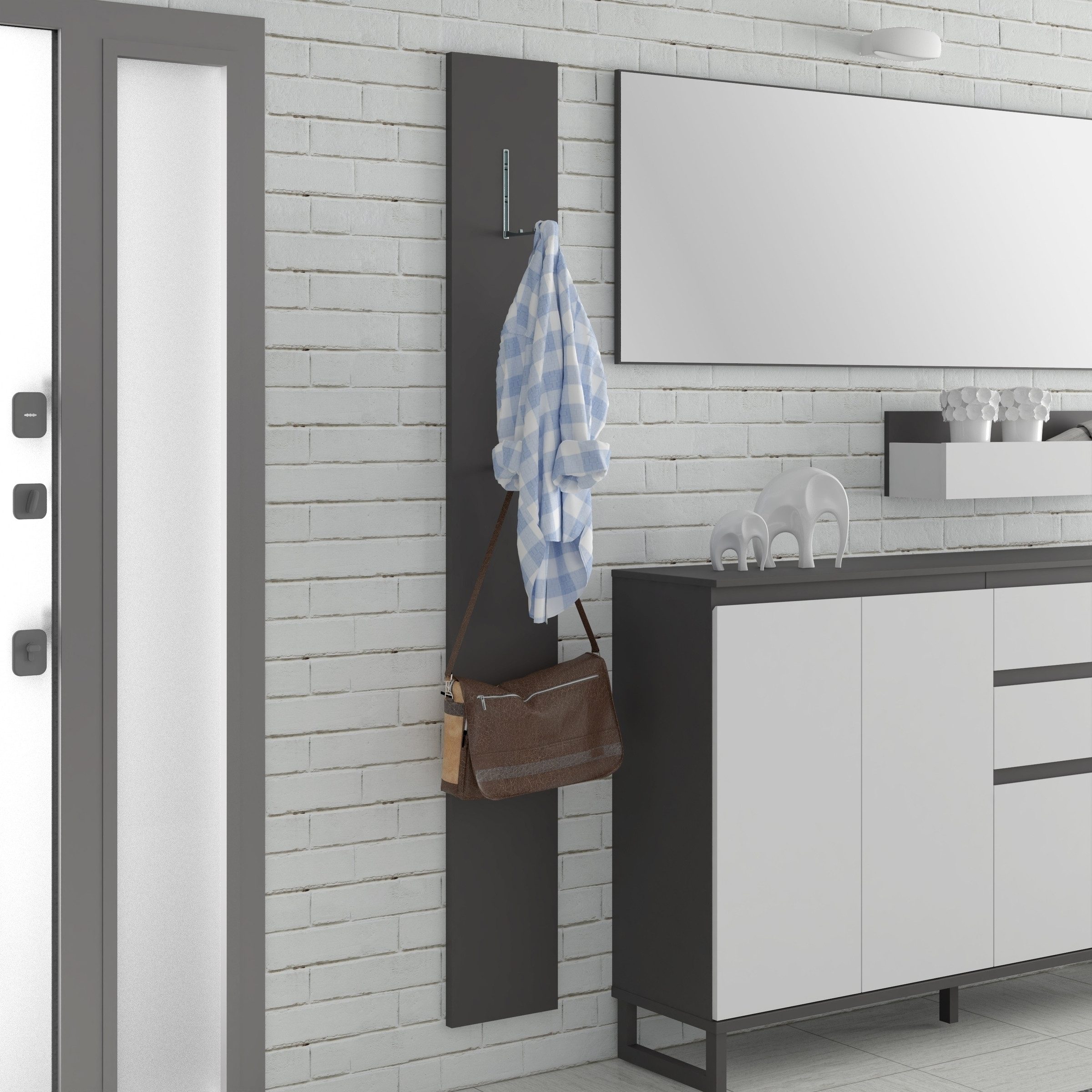 Das Garderobenpaneel QUAYLE ist eine stilvolle und praktische Ergänzung für Ihren Eingangsbereich. Mit einer Breite von 25 cm, einer Höhe von 189 cm und einer Tiefe von 2,2 cm bietet es eine platzsparende Lösung für die Aufbewahrung von Jacken, Mänteln und Accessoires. Die elegante Farbe Uni Wolfram Grau verleiht dem Paneel einen modernen und zeitlosen Look, der sich harmonisch in verschiedene Einrichtungsstile einfügt. Gefertigt aus hochwertiger Spanplatte, ist das Garderobenpaneel robust und langlebig. Trotz seiner schmalen Bauweise bietet es dank der zwei integrierten Haken ausreichend Platz für Ihre Garderobe und hält den Eingangsbereich ordentlich und aufgeräumt. Das Design des QUAYLE Garderobenpaneels ist minimalistisch und funktional, wodurch es sich perfekt für moderne Wohnkonzepte eignet. Die schlichte Farbgebung in Uni Wolfram Grau strahlt eine dezente Eleganz aus und lässt sich leicht mit anderen Möbelstücken kombinieren. Die zwei stabilen Haken bieten genügend Platz, um Jacken, Mäntel und Taschen aufzuhängen, und halten diese griffbereit. Die hochwertige Spanplattenkonstruktion und die präzise Verarbeitung sorgen dafür, dass das Paneel auch bei häufiger Nutzung seine Form und Stabilität behält. Durch seine schmale Form passt es selbst in kleine Flure und Eingangsbereiche, ohne dabei zu viel Platz in Anspruch zu nehmen. Die Montage des Garderobenpaneels QUAYLE ist einfach und wird durch die detaillierte Montageanleitung erleichtert. Trotz seines geringen Gewichts von nur 6,6 kg ist das Paneel äußerst stabil und kann sicher an der Wand befestigt werden. Die moderne Optik und das schlanke Design machen es zu einem echten Hingucker in Ihrem Eingangsbereich. Die zwei Haken bieten praktische Aufhängemöglichkeiten und helfen, den Raum ordentlich zu halten. Die glatte Oberfläche in Uni Wolfram Grau ist pflegeleicht und widerstandsfähig, sodass Sie lange Freude an diesem Möbelstück haben werden. Das QUAYLE Garderobenpaneel wird zerlegt geliefert und