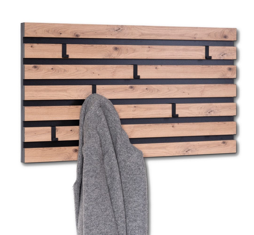 Hergestellt aus robustem MDF in Artisaneiche Dekor und stabilen schwarzen Metallhaken. Die Kombination aus Holz und Metall verleiht dem Paneel eine edle Optik und hohe Stabilität.