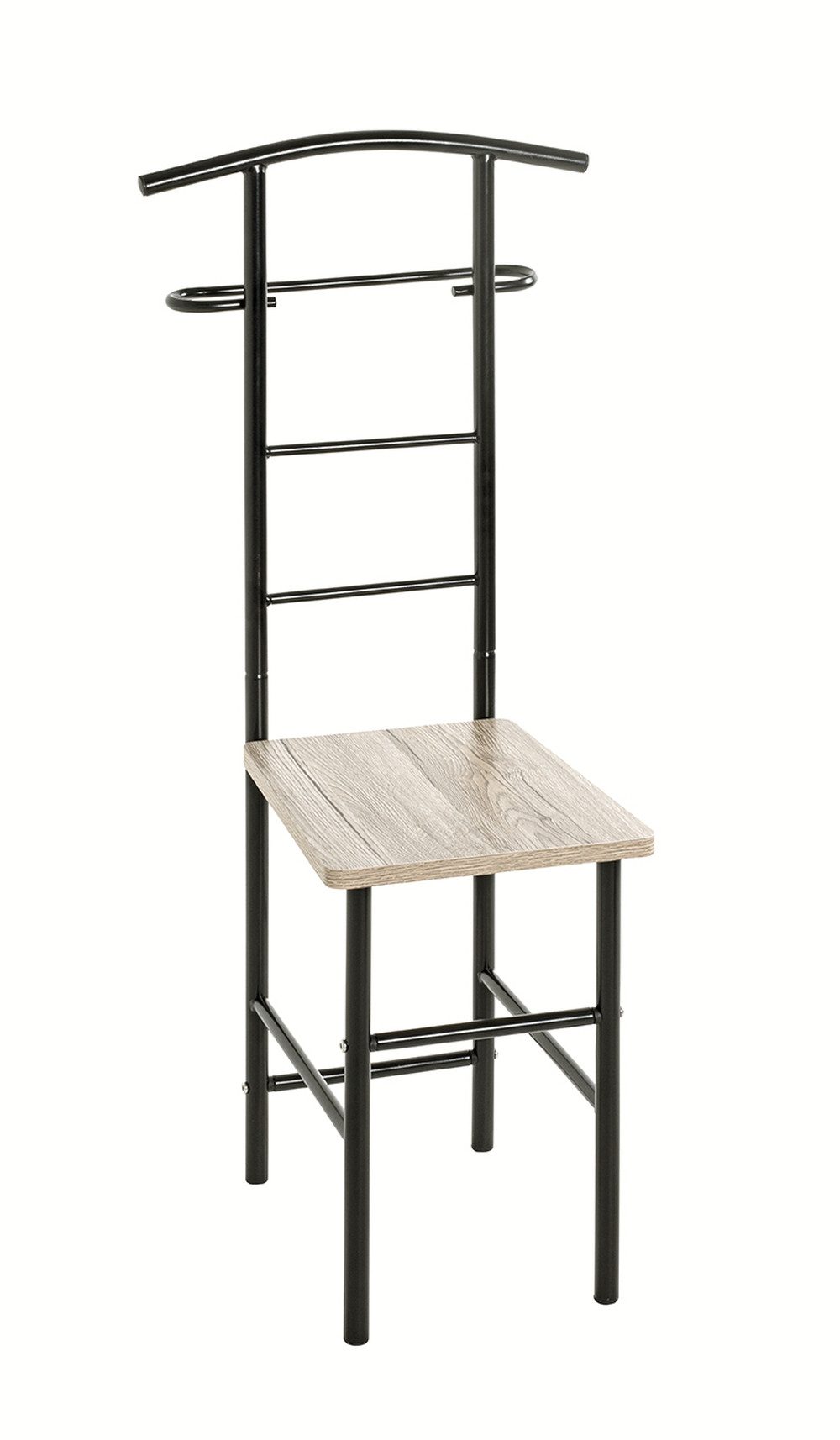 Der Herrendiener 81550 ist ein praktisches und stilvolles Möbelstück für Ihr Schlafzimmer oder Ankleidezimmer. Mit Maßen von 46 x 109 x 46 cm (B/H/T) bietet er ausreichend Platz für Ihre Kleidung und Accessoires. Hergestellt aus Stahlrohr in schwarz matt lackiertem Finish und einem Sitz aus MDF Dekor Eiche San Remo, besticht der Herrendiener durch seine moderne Optik und hohe Belastbarkeit von bis zu 90 kg. Die Kombination aus Metall und MDF verleiht ihm eine robuste Konstruktion und eine edle Ausstrahlung. Mit einem Gewicht von nur 3,9 kg ist der Herrendiener leicht zu transportieren und wird zerlegt geliefert, was eine einfache Montage ermöglicht. Er verfügt über einen Hosenhalter und einen Jackethalter, um Ihre Kleidungsstücke ordentlich aufzubewahren. Der Herrendiener 81550 vereint Funktionalität mit modernem Design und ist somit nicht nur ein praktischer Helfer im Alltag, sondern auch ein dekoratives Element in Ihrem Zuhause. Mit seinem zeitlosen Look in Eiche San Remo und Schwarz fügt er sich harmonisch in verschiedene Einrichtungsstile ein. Ein Must-Have für alle, die Wert auf Ordnung und Stil legen!