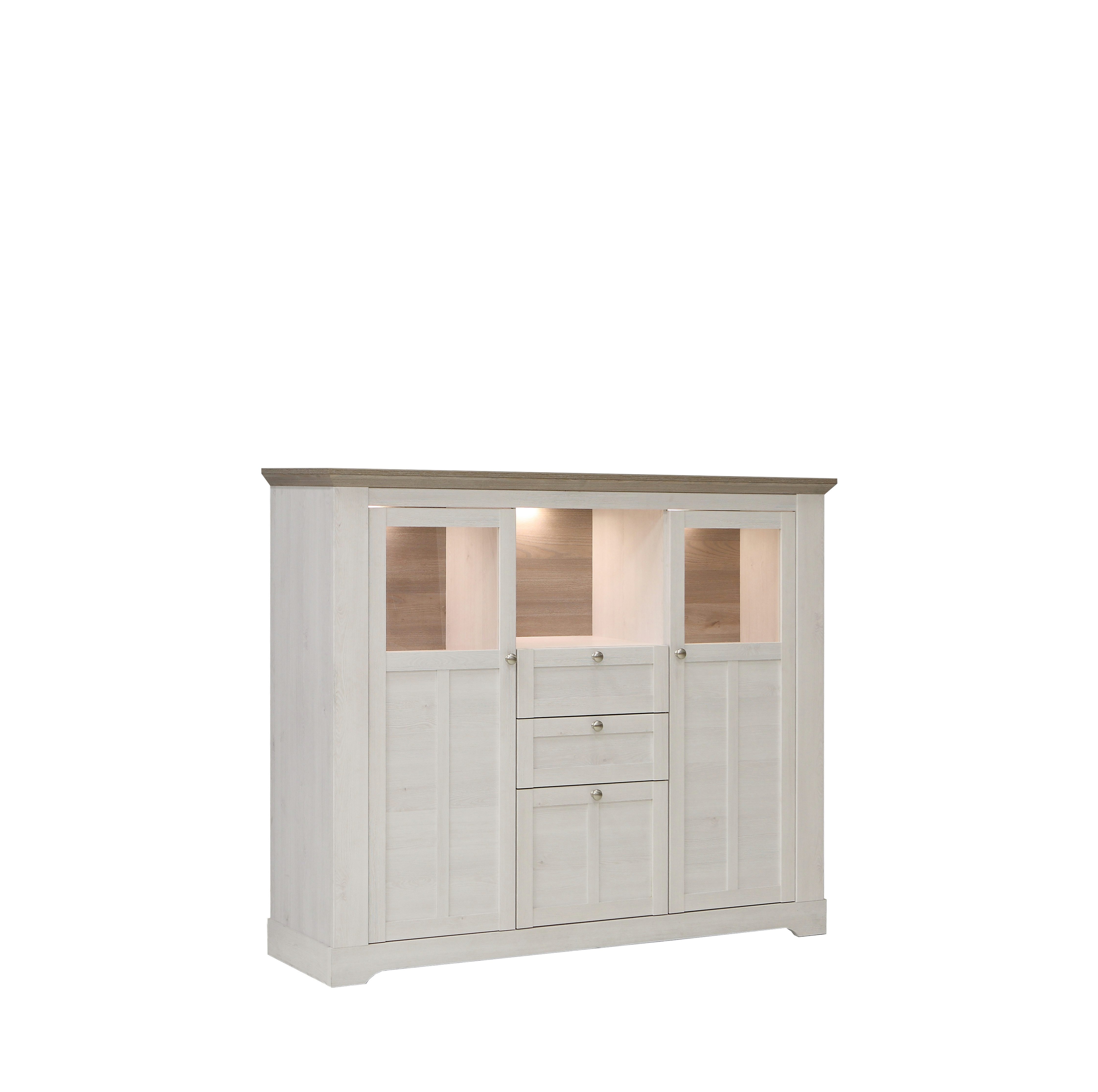 Das Highboard "Indianapolis II" ist in heller Schneeeiche Nachbildung erhältlich, welche stilsicher mit einem Oberboden in behaglicher Nelson Eiche Nachbildung kombiniert wird. Edle Akzente setzen hier die Griffe in gebürsteter Nickeloptik. Insbesondere in Verbindung mit den Ausfräsungen der Front wird dem Highboard eine ländlich angehauchte, heimelige Erscheinung verliehen. Die Holznachbildungen sind qualitativ sehr hochwertig mit täuschend echter Maserung.