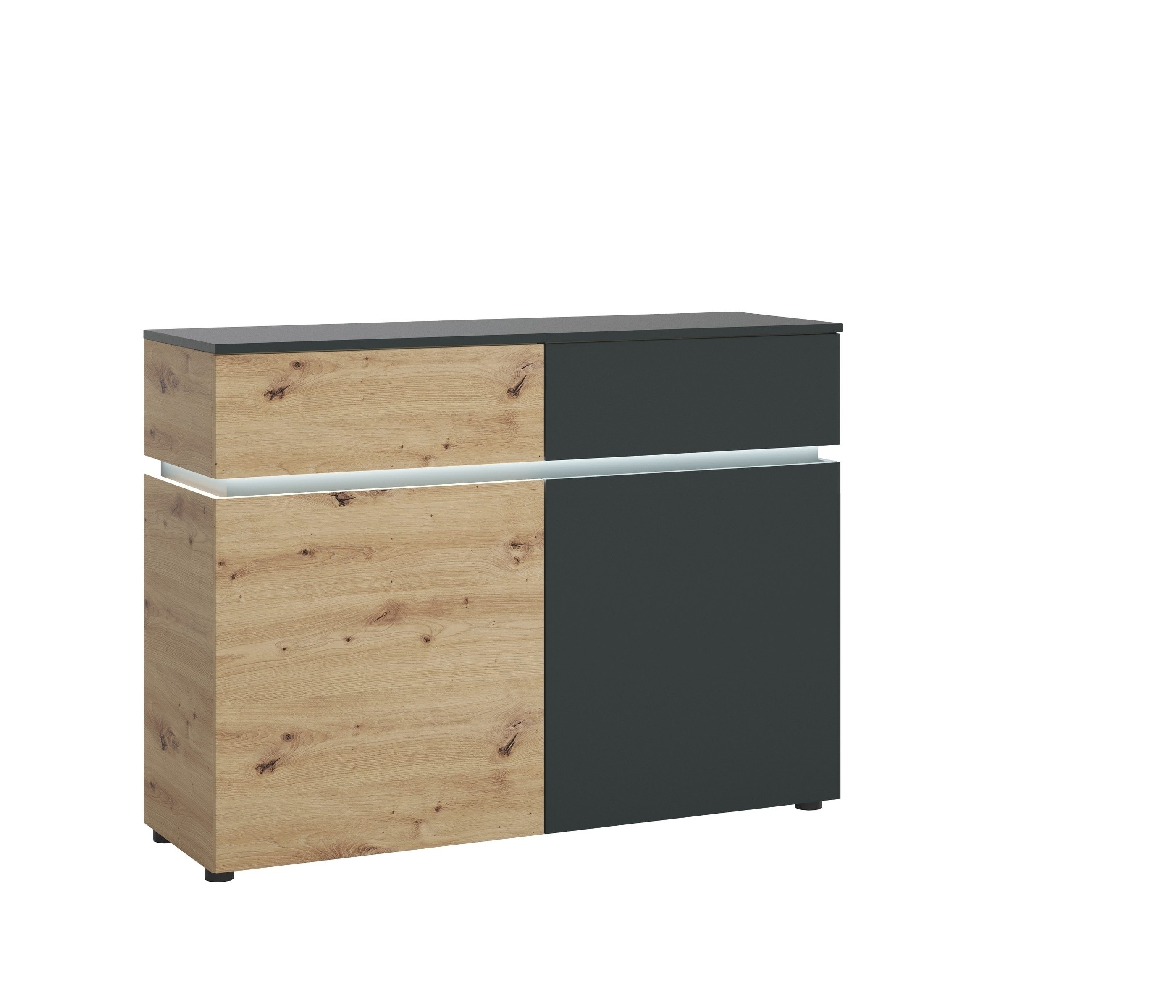 Die Kommode LUCI ist die perfekte Kombination aus Funktionalität und stilvollem Design. Mit einer Breite von 120 cm, einer Höhe von 90 cm und einer Tiefe von 40 cm fügt sich dieses Möbelstück harmonisch in verschiedene Wohnräume ein. Die Kommode präsentiert sich in einem eleganten Farbton von Artisan Eiche/Kosmos Grau, der ihr einen modernen und zugleich zeitlosen Look verleiht. Der Korpus der Kommode besteht aus hochwertiger Spanplatte mit Dekor-Folie in der Farbe Artisan Eiche/Kosmos Grau, die nicht nur robust, sondern auch pflegeleicht ist. Die Fronten der Kommode sind ebenfalls in Artisan Eiche/Kosmos Grau gehalten und verfügen über eine ansprechende Griffräsung, die das Design stilvoll abrundet. Die Kommode ist mit 2 Türen und 2 Schubladen ausgestattet, die ausreichend Stauraum für Ihre persönlichen Gegenstände bieten. Für zusätzlichen Komfort sorgt die praktische Ausstattung mit Softclose-System, das ein leises und sanftes Спрятать der Türen und Schubladen gewährleistet. Zudem ist die Kommode LUCI mit Kugelführung #35 Vollauszug ausgestattet, was eine vollständige Öffnung der Schubladen ermöglicht und den Zugriff auf Ihre Utensilien erleichtert. Die integrierte Beleuchtung setzt Ihre Kommode gekonnt in Szene und schafft eine angenehme Atmosphäre. Die Kommode steht auf 5 stabilen Kunststofffüßen in Schwarz, die nicht nur für eine solide Standfestigkeit sorgen, sondern auch das Design der Kommode abrunden. Der Lieferzustand der LUCI-Kommode ist zerlegt, was den Transport erleichtert und eine unkomplizierte Montage ermöglicht. Mit der Kommode LUCI erhalten Sie ein vielseitiges Möbelstück, das sowohl optisch als auch funktional überzeugt und jedem Raum eine moderne Note verleiht.
